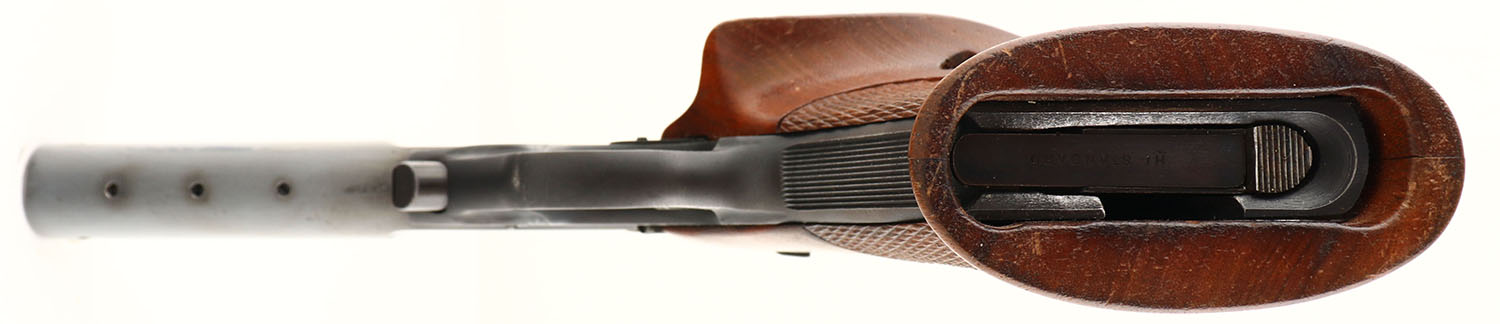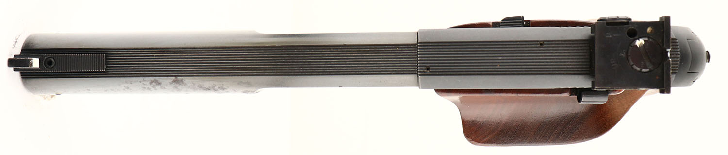 High-Standard, Model S-103 ''Supermatic Citation'', CAL: 22LR, MFG: 1963, SN: 1327181, Semi-Auto Pistol, 5 1/2 '' barrel. Approximately 24,000 model 103 Supermatics produced from 1960 to 63. The checkered walnut target grips, with right hand thumb rest, are excellent, with some light scuffs. The metal blue finish rates 85% overall, with some light wear at the muzzle of the barrel. There is 3'' section of rust pitting on the left side of barrel from improper storage, which appears to have bluing touch-up. Barrel is factory tapped/threaded for barrel weights, none attached. The frame contains serrations on the front & back sections of grip for added retention. Bore is excellent & bright. Factory adjustable rear sight & fixed blade front sight, both have white paint accenting. Hi-Standard marked magazine. FFL or C&R Req. - Value: 400 to 800