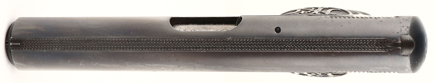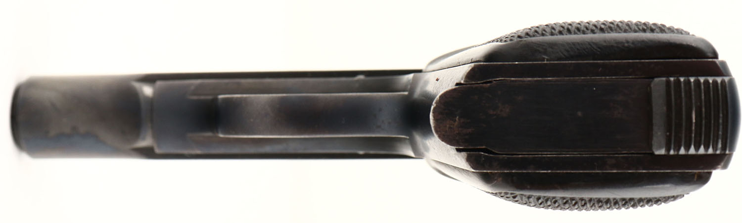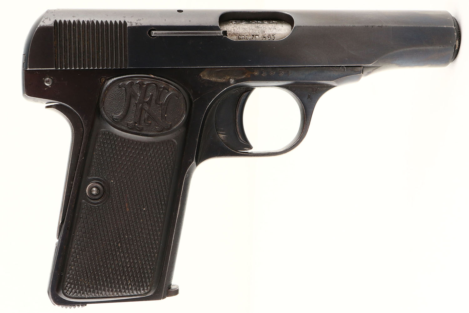 A blowback semi-automatic pistol designed by John Browning. Approximately 705,000 produced, mainly for the European market, WWI & WWII. The pistol incorporates the standard Browning striker-firing mechanism, a grip safety along with a magazine safety & an external safety lever (known as the ''triple safety'') in a compact package. The original checked grips are excellent with ''FN'' logo on top. The metal blue finish is 95%. There is a ground gouge in the frame above the trigger on the right side. Bore is excellent & bright. Notch & fixed blade sights. Original FN marked 7 round mag. FFL or C&R Req. - Value: 600 to 1000