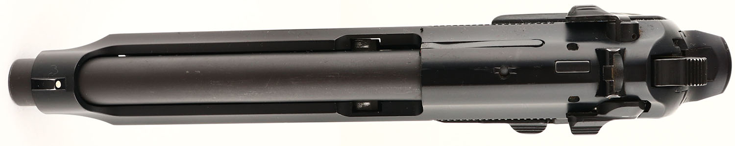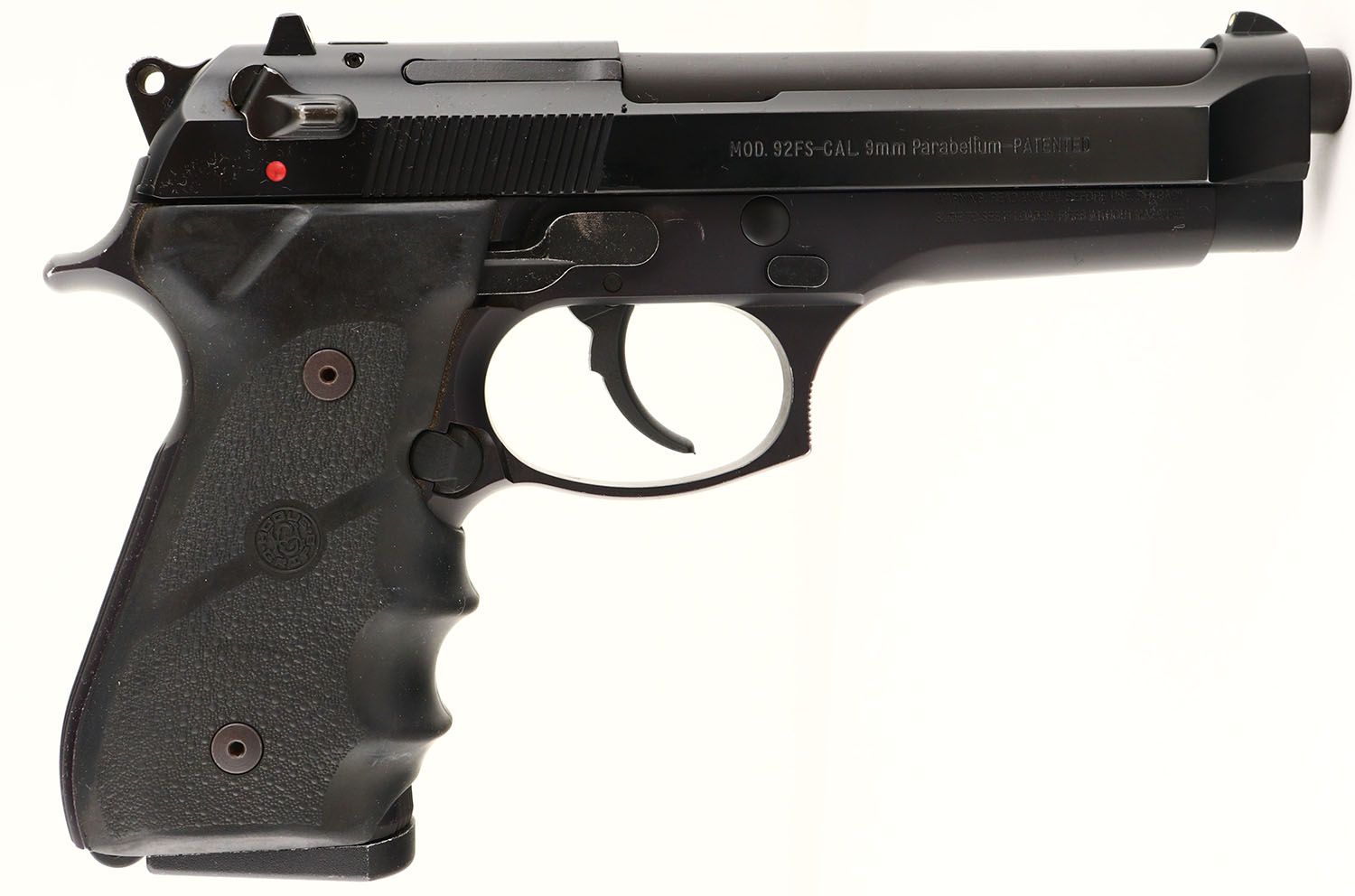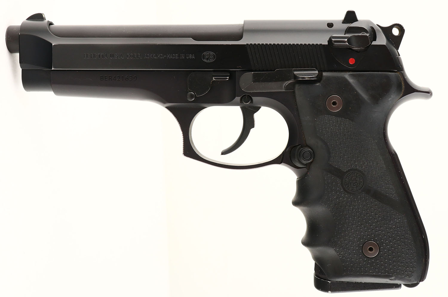 Beretta, Model 92 FS, CAL: 9mm, MFG: 1976-Present, SN: BER421639, Semi Auto Pistol, 4 7/8'' barrel. The matte black finish on the frame is excellent, with very light edge wear. The frame carries upgraded Hogue Grips. The matte black finish on the slide & barrel is excellent, with light scrapes & blemishes. Bore is very good & bright, with spotting amongst proud rifling. The slide holds a dual white dot rear sight & single white dot blade front sight. The United States Military replaced the .45 ACP M1911A1 pistol in 1985 with the Beretta 92FS. FFL Req. - Value: 300 to 600