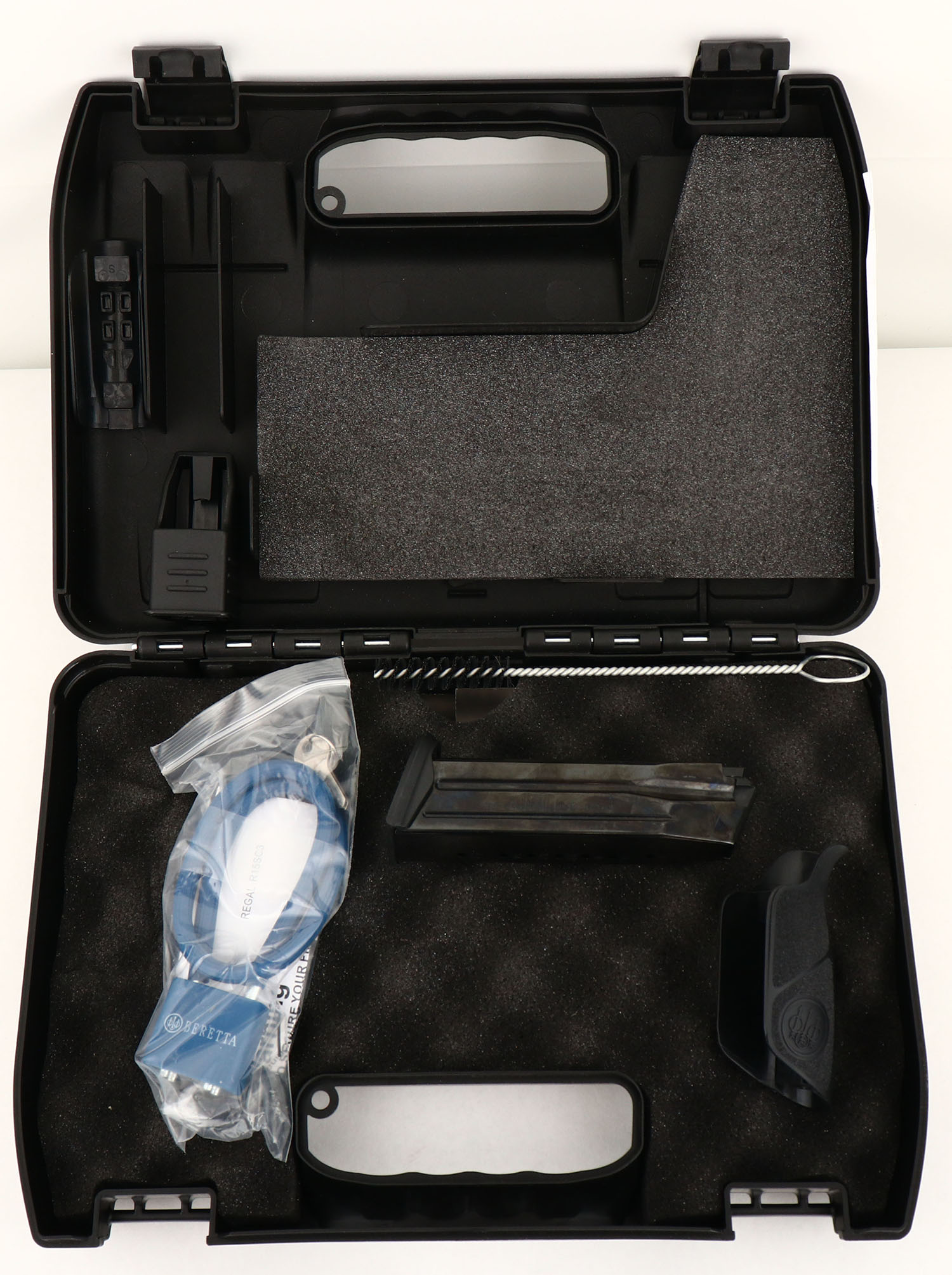 Beretta, Model APX, CAL: 9mm, MFG: Modern, SN: A114594X, Semi Auto Pistol, 4 1/8'' barrel. The Beretta marked Techno polymer frame is excellent. The matte black finish on the slide is excellent, rating 99%. Bore is near mint. Factory sights. Comes in the original hard case, with the owners manual, cleaning brush, lock, extra mag, extra grips & speed loader. FFL Req. - Value: 400 to 600