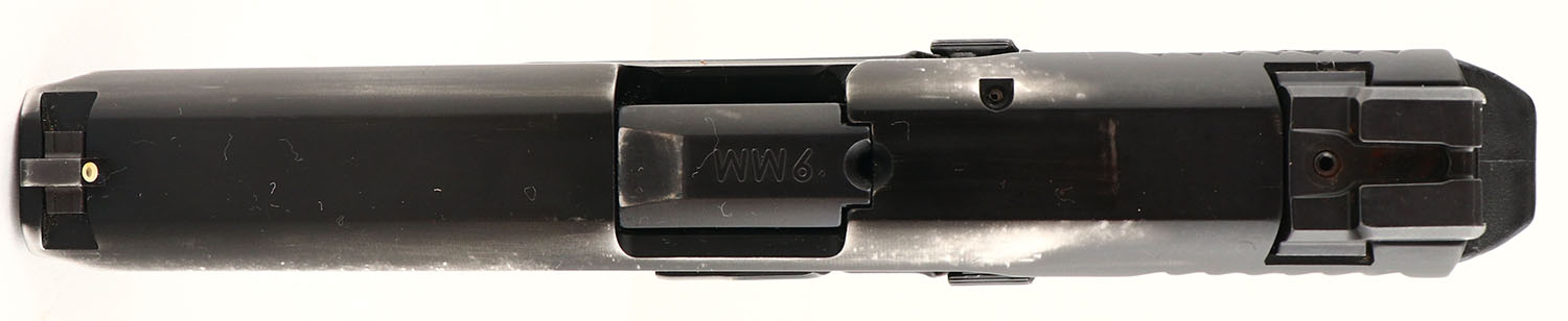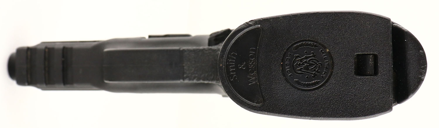 Smith & Wesson, Model M&P9, CAL: 9mm, MFG: Modern, SN: HUY0820, Semi Auto Pistol, 4'' barrel. The textured polymer frame, with textured rubber grips are excellent. The matte black finish on the slide rates 85% overall, with areas worn to gun metal gray. Bore is excellent & bright. The slide carries a dual white dot rear sight & single white dot blade front sight. A great pistol for utilitarian use. FFL Req. - Value: 300 to 600