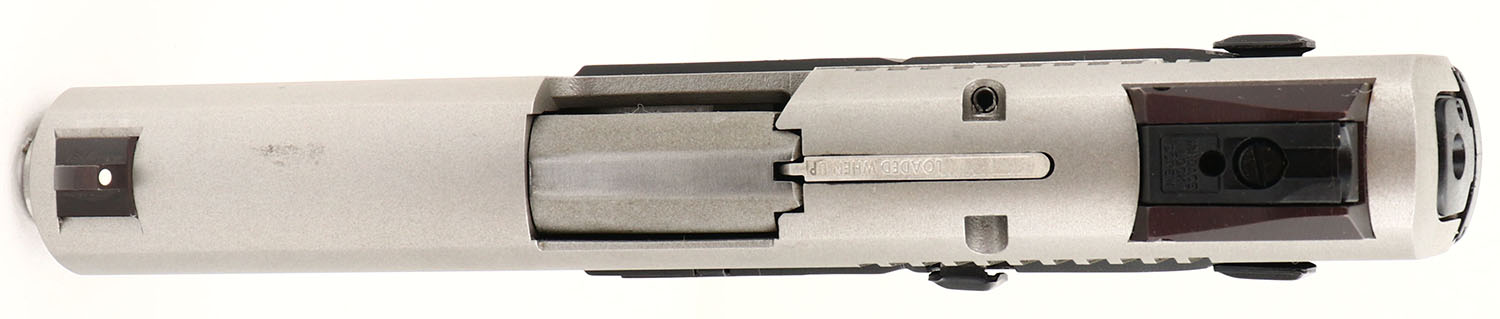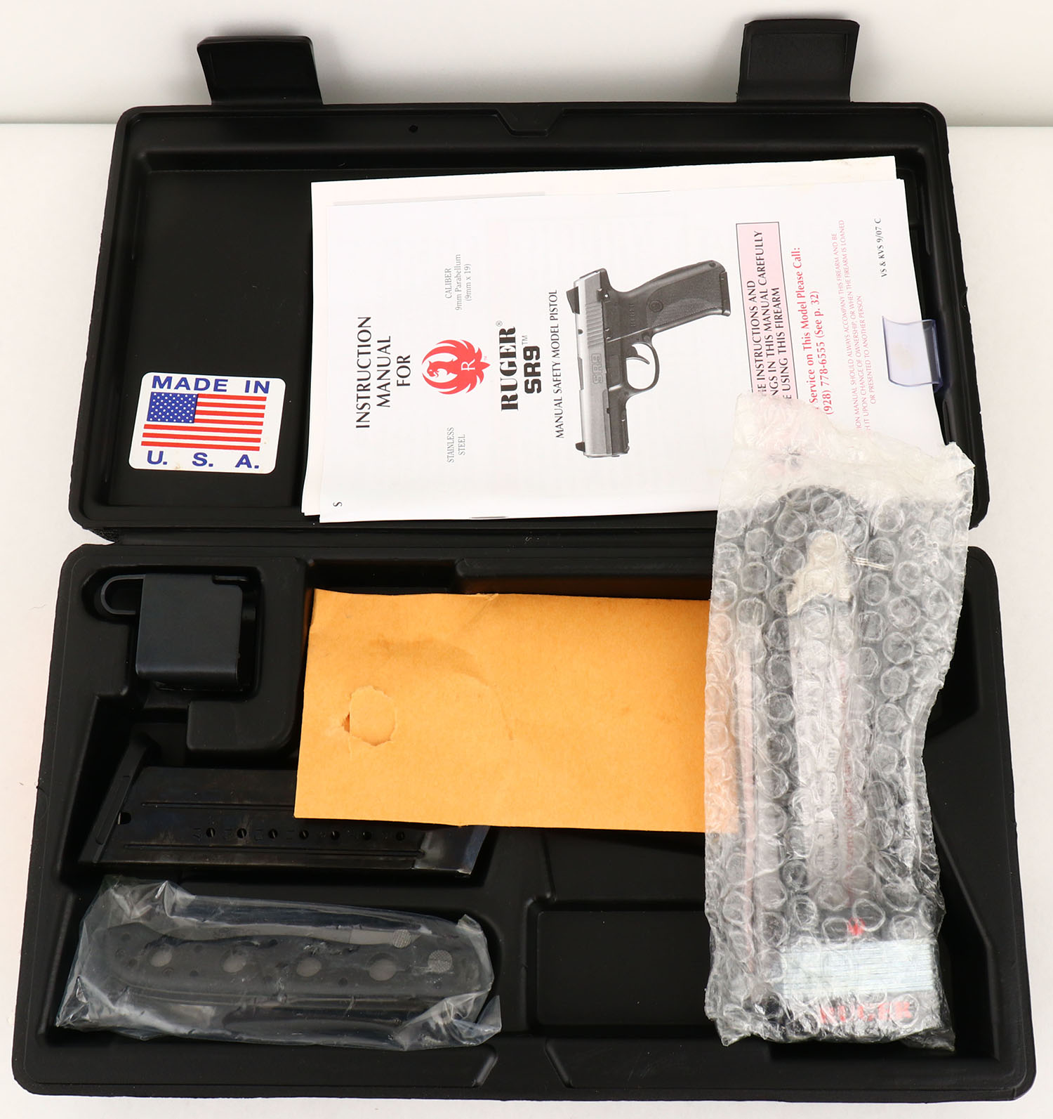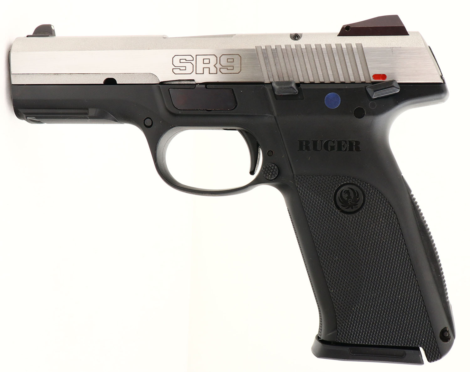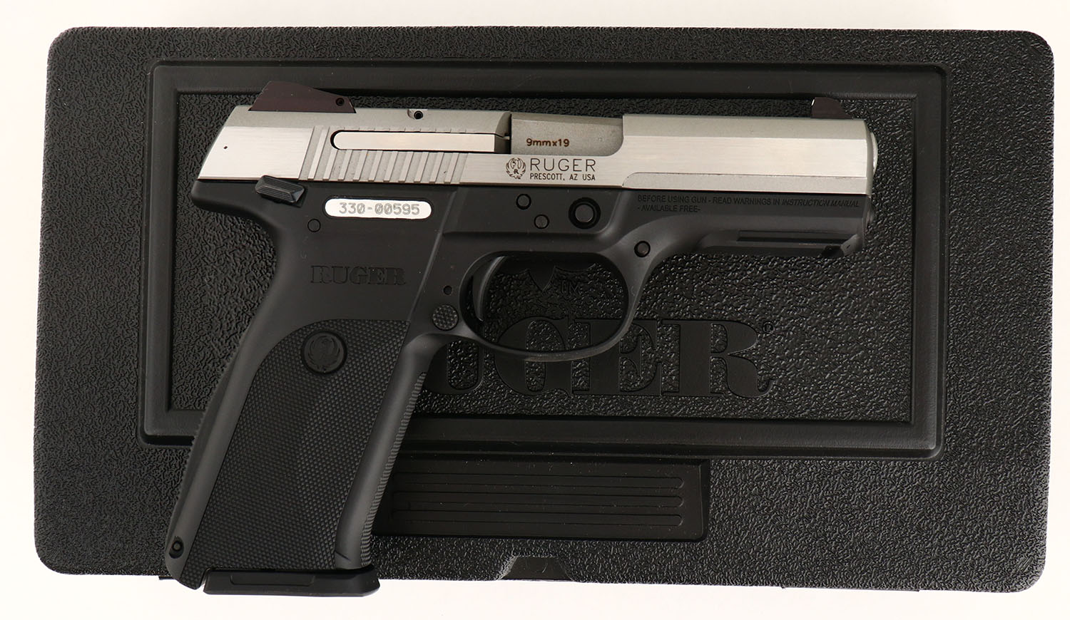 CASED Ruger, Model SR9FP, CAL: 9mm, MFG: Modern, SN: 330-00595, Semi-Auto Pistol, 4'' barrel, has 2 16 round mags plus a Knife. The Ruger marked checkered grip is excellent. The stainless steel metal finish rates 100% overall. Bore is excellent. Factory white dot sights. Comes in factory hard case, with bonus pocket knive, extra mag, paperwork, lock & factory spent casing. NOS, FFL Req. - Value: 300 to 600