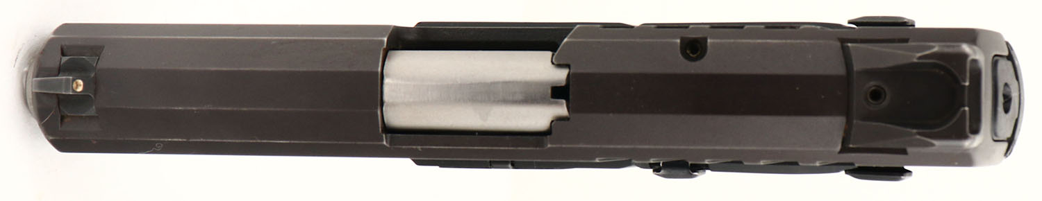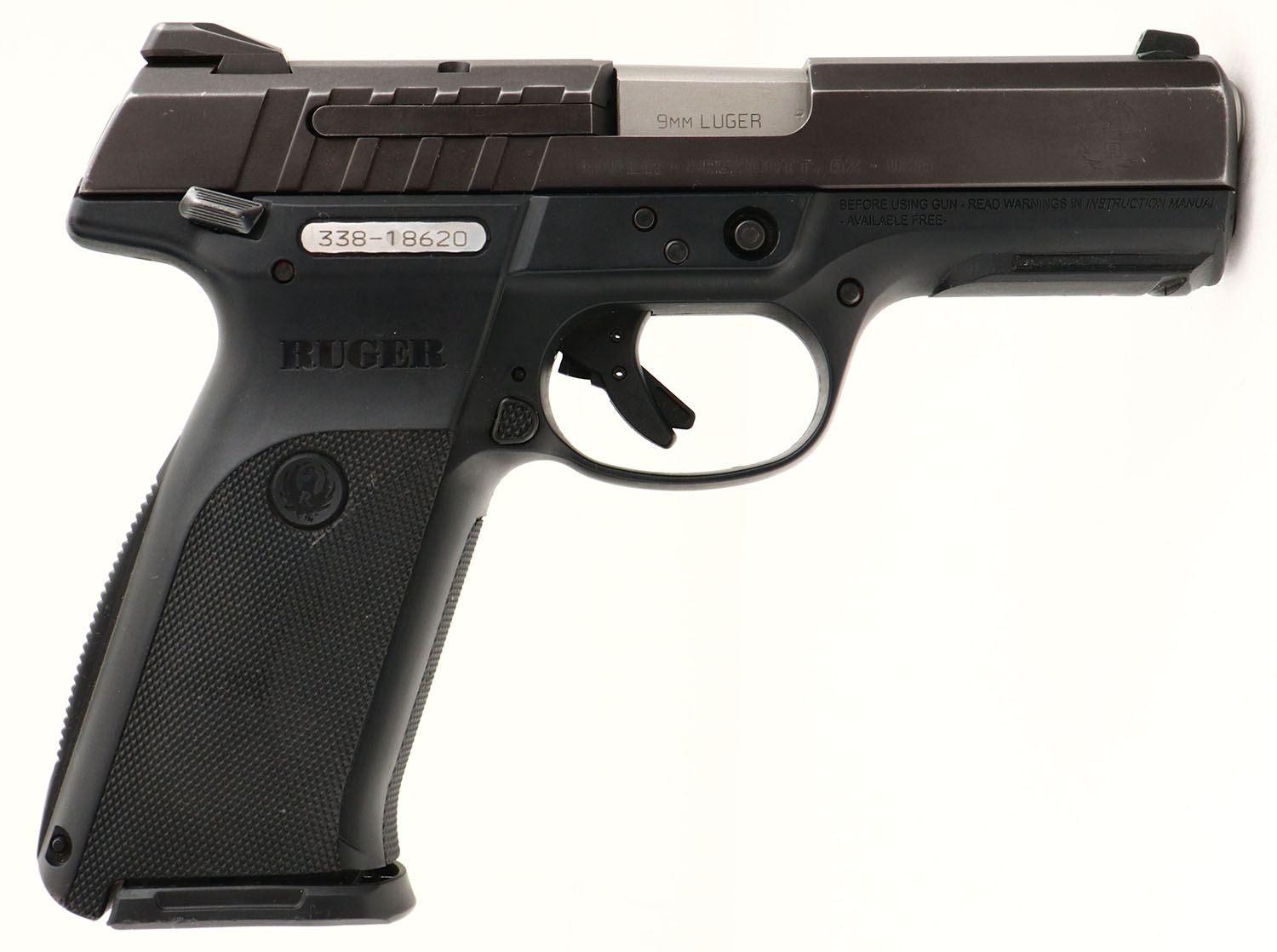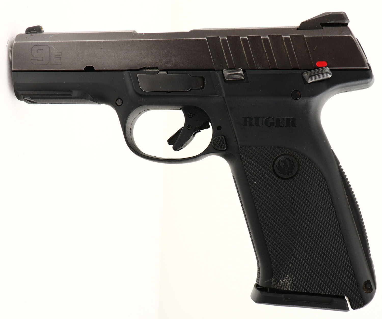 Ruger, Model E9, CAL: 9mm, MFG: 2017, SN: 338-18620, Semi Auto Pistol, 4'' barrel. The Ruger logo textured polymer grip frame is excellent, with minor handling marks. The metal blue finish on the slide rates 95% overall, with blemishes, spotting & speckling, toning to a brown patina. Bore is very good & bright, displaying normal wear from use. The slide holds a dual white dot rear sight & single white dot blade front sight. A good utilitarian 9mm. FFL Req. - Value: 200 to 400