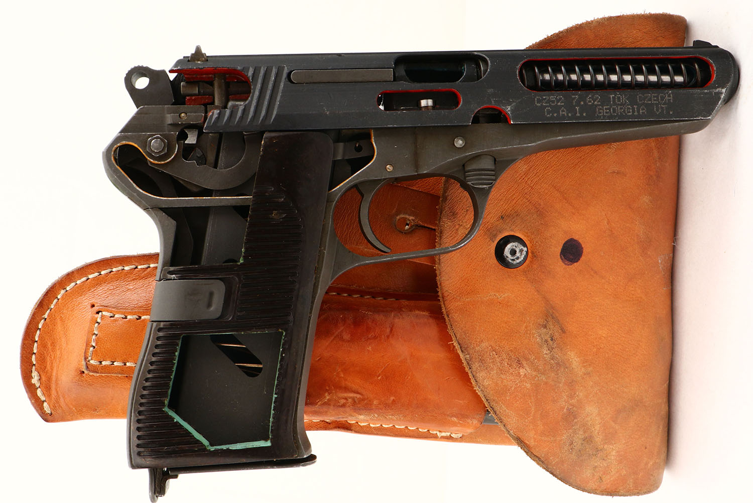 CZ, CUT-A-WAY SALESMAN SAMPLE or DEMO PISTOL, Model CZ52, 7.62 TOK Cal, MFG: 1953-54, SN: CUT301, Semi Auto Pistol, 3 3/4'' barrel, The molded plastic grips are very good, The metal matte finish is 60%, Bore is excellent, Unusual, factory cut-a-way. Comes with a leather holster with extra mag. No FFL Req. - Value: 200 to 500