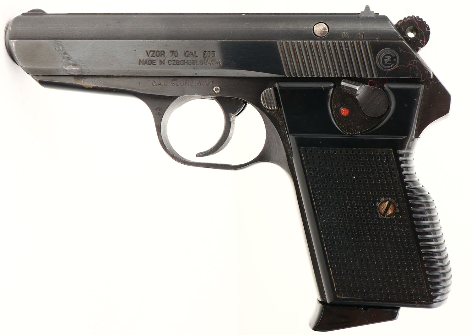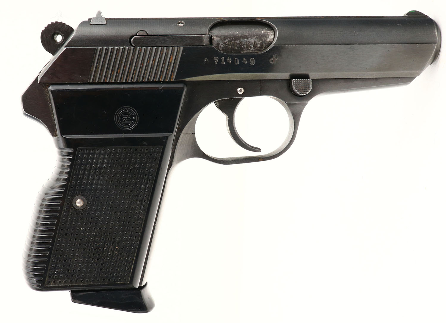 CZ, Model ''VZOR 70'', CAL: 7.65 (.32), MFG: 1970-83, SN: 714049, Semi Auto Pistol, 3 3/4'' barrel. The CZ marked checkered & grooved plastic grips are very good, with handling marks. The metal blue finish rates 90% overall, with minor scuffs & an areas of flaking, worn to metal gray. Bore is excellent. The slide holds an adjustable rear sight & blade front sight. In 1970 the CZ 70 replaced the CZ 50 & became the standard sidearm of Czechoslovak armed forces & police until 1983. FFL Req. - Value: 250 to 500