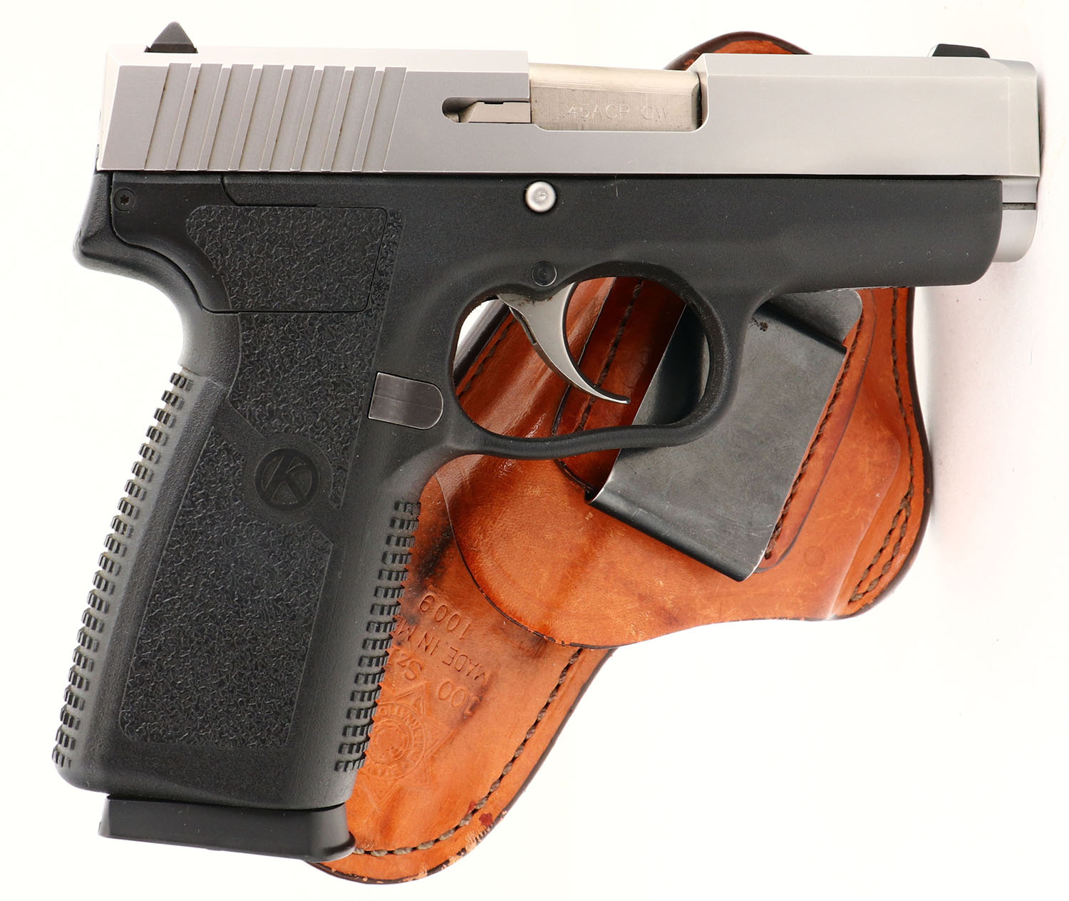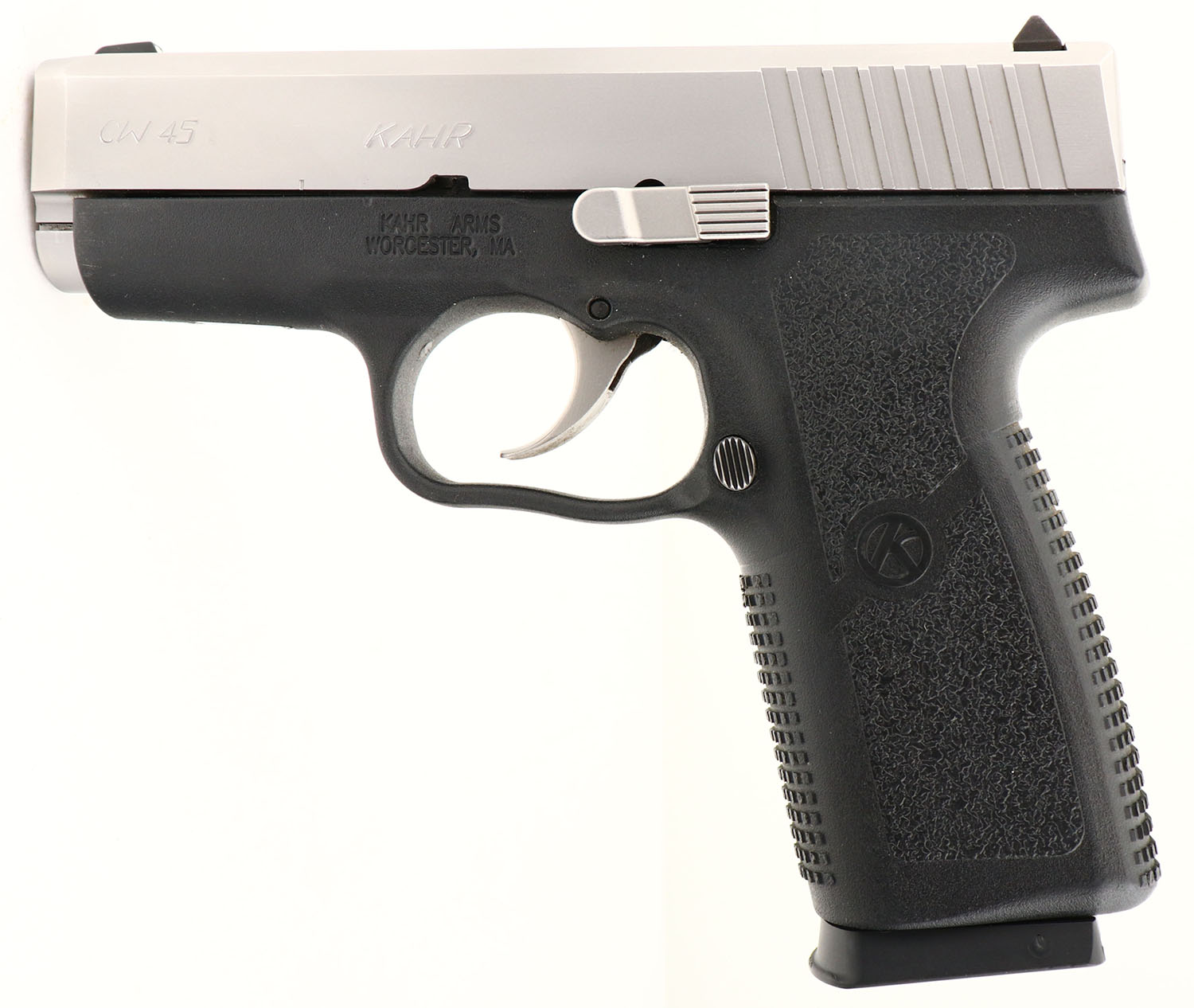 Kahr Model CW45, .45 ACP Semi-Auto Pistol, Mfg. Modern, SN: SD1935, 3 1/2'' barrel, The integrated grips are excellent, The matte silver finish on slide, barrel & trigger is 99%, Mechanically sound. Bore is excellent. Original factory mag. Plus extra mag. Come with a leather holster. FFL Req. - Value: 300 to 500