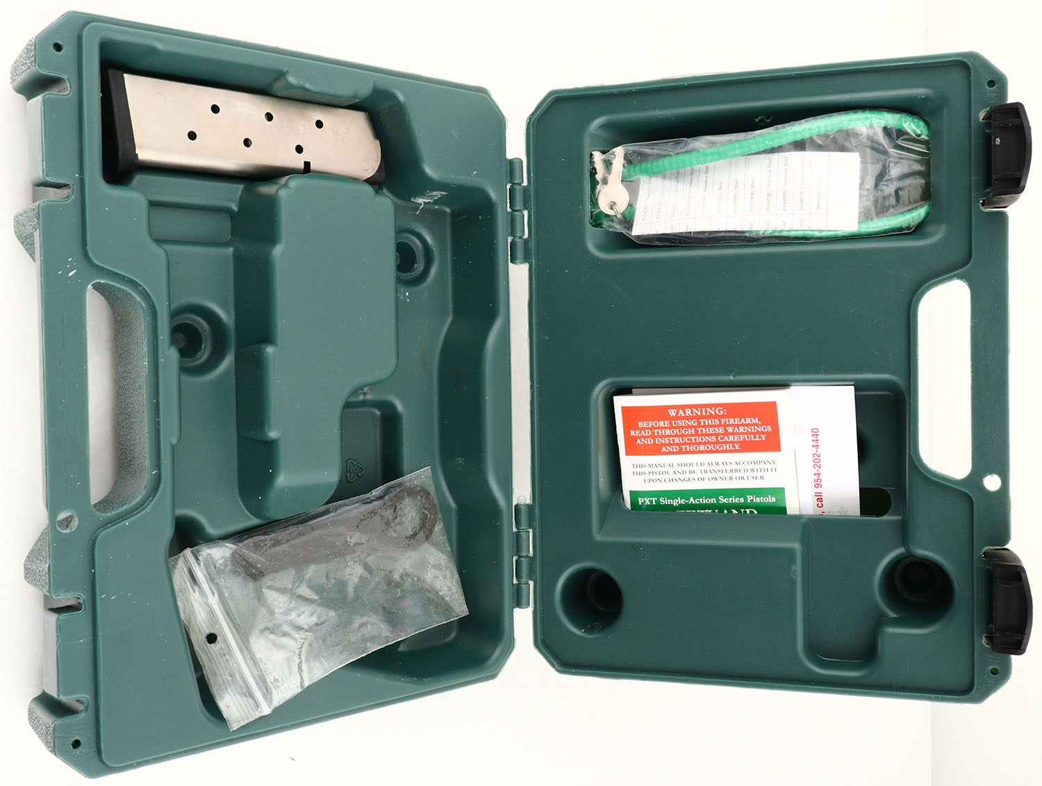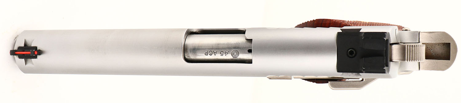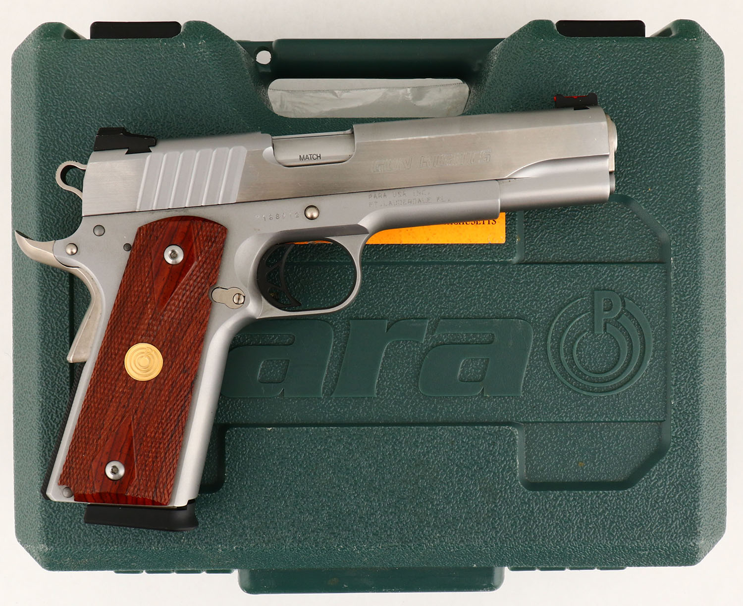 CASED, Para, 1911 ''Gun Rights'' Edition, CAL: 45, MFG: Modern, SN: P188912, Semi Auto Pistol, 5'' barrel. The Para logo medallion & checkered wood grips are excellent. The backstrap is checkered. The satin silver finish on the frame is excellent, with a minor drag line from the safety. The polished stainless steel slide is excellent, with minor handling marks. Bore is excellent, near mint. The slide holds a dual white dot rear sight & red fiber optic front sight. Comes in the factory hard case, with owners manual, extra mag, lock & tool. NOS. FFL Req. - Value: 500 to 1000
