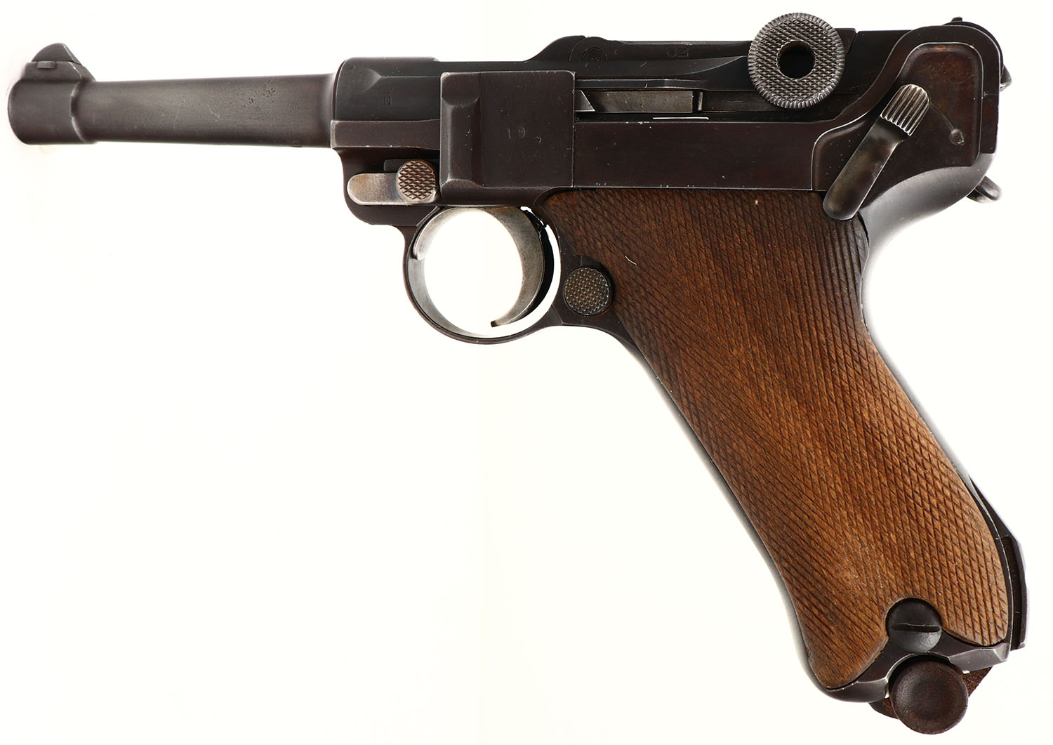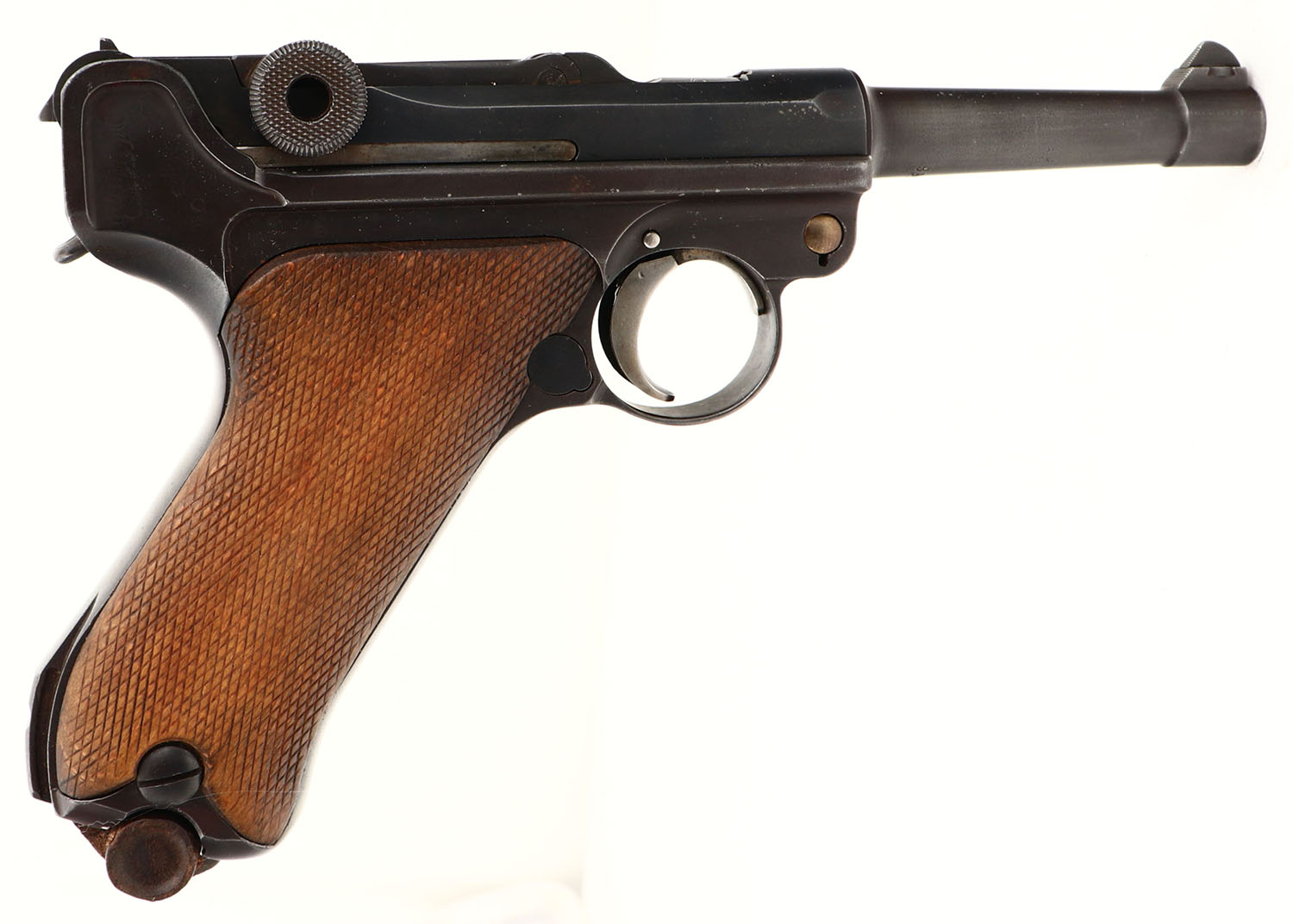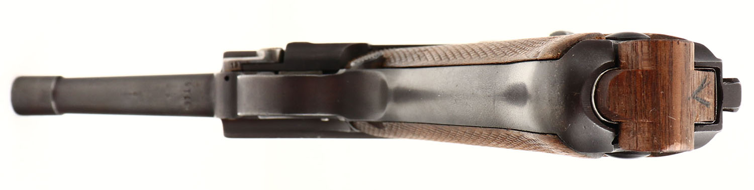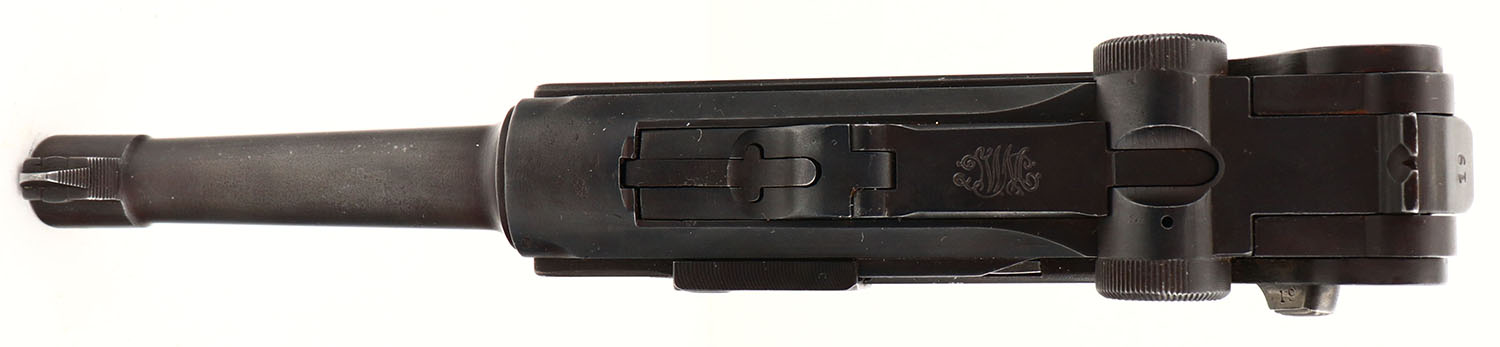UNCOMMON! DWM, 1919 Commercial Luger, CAL: 7.65x21 (.30) MFG: 1919-21, SN: 89119, Semi Auto Pistol, 3 3/4'' barrel. The original checkered wood grips are very good, with checkering beginning to smooth. The restored metal finish rates 90% overall, toning to a brown patina, with some cleaned pitting & speckling under the finish. The front face of the frame & the bottom of the barrel are each marked with the full SN ''89119''. There are crown over ''N'' commercial proofs on the bottom of the barrel, the left of the barrel extension & the left of the front of the frame. The top of the toggle-link has the ''DWM'' logo. There are partial matching SN ''19'' on the side plate, bottom of the takedown lever & back of the rear toggle-link. Bore is very good, with light speckling. The barrel holds a dorsal fin shaped blade & the rear toggle-link has a fixed V notch rear sight. The 1919 Commercial model was generally made for commercial sales immediately following the WW I. These have previously been referred to as the 1923 Commercial model. This variation of Luger is uncommon, with appx 13,000 produced. Comes with a wooden end detachable mag, with a ''V'' marking on bottom. FFL or C&R Req. - Value: 800 to 1600