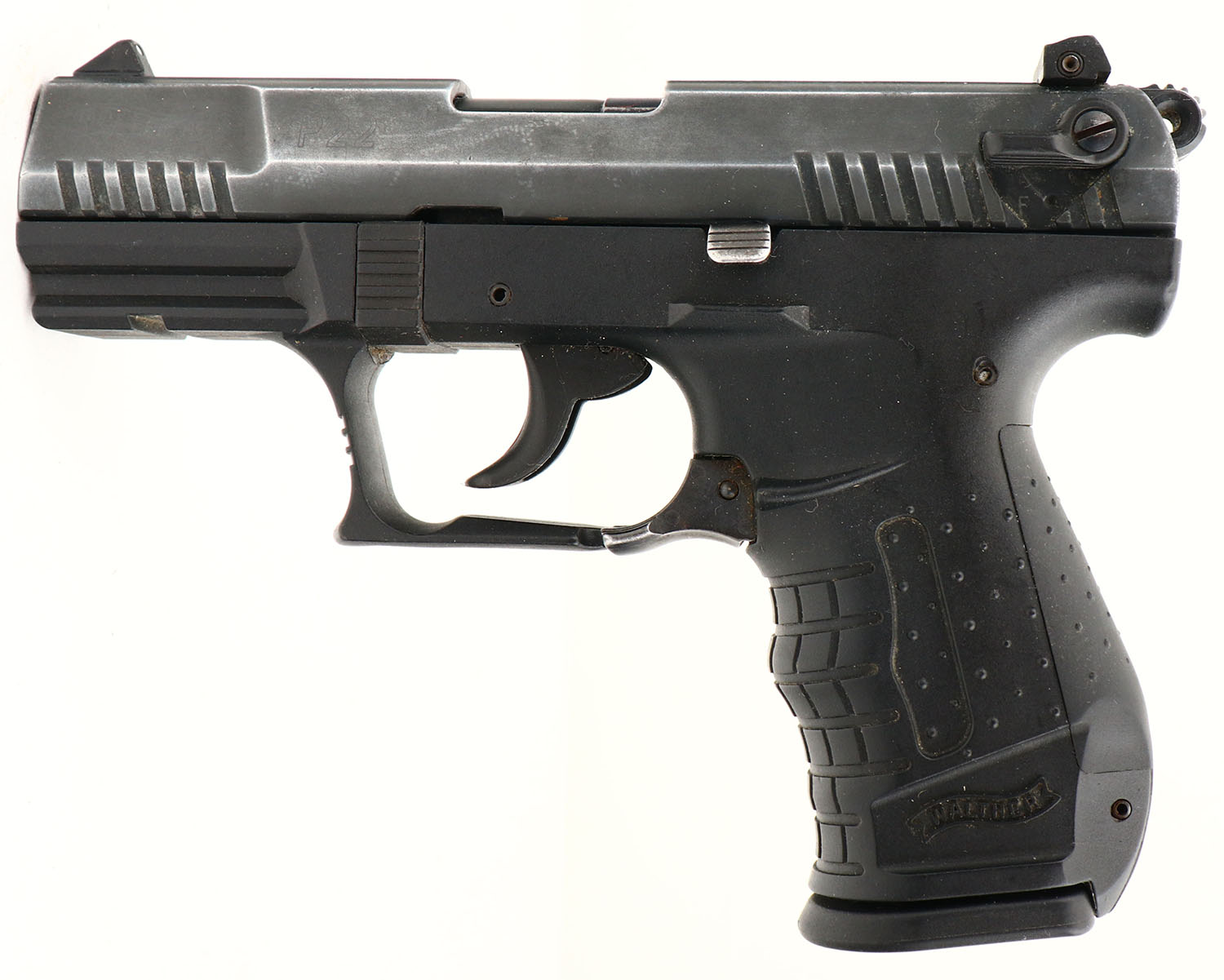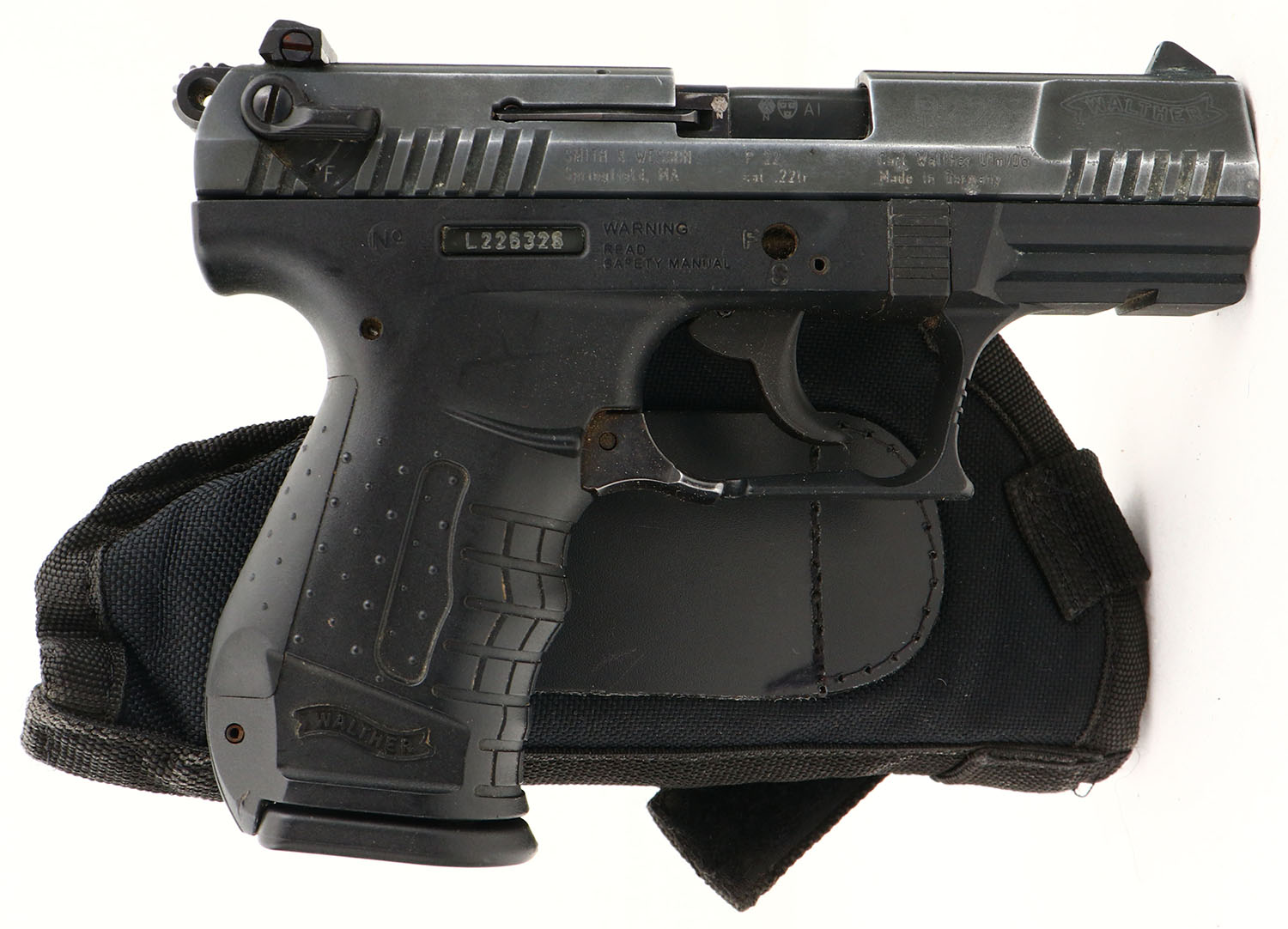 Walther, P22, CAL: 22LR, MFG: Modern, SN: L226326, Semi Auto Pistol, 3 1/2'' barrel. The grooved & textured polymer grip frame is excellent, with minor handling marks. The metal blue finish on the slide has worn or toned to a matte gray tone, with wear at the edges. Bore is excellent. The slide holds a dual white dot rear sight & single white dot blade front sight. Comes with (2) additional mags & Front Line holster. FFL Req. - Value: 150 to 300