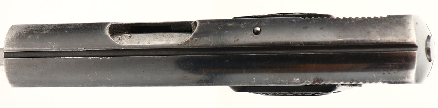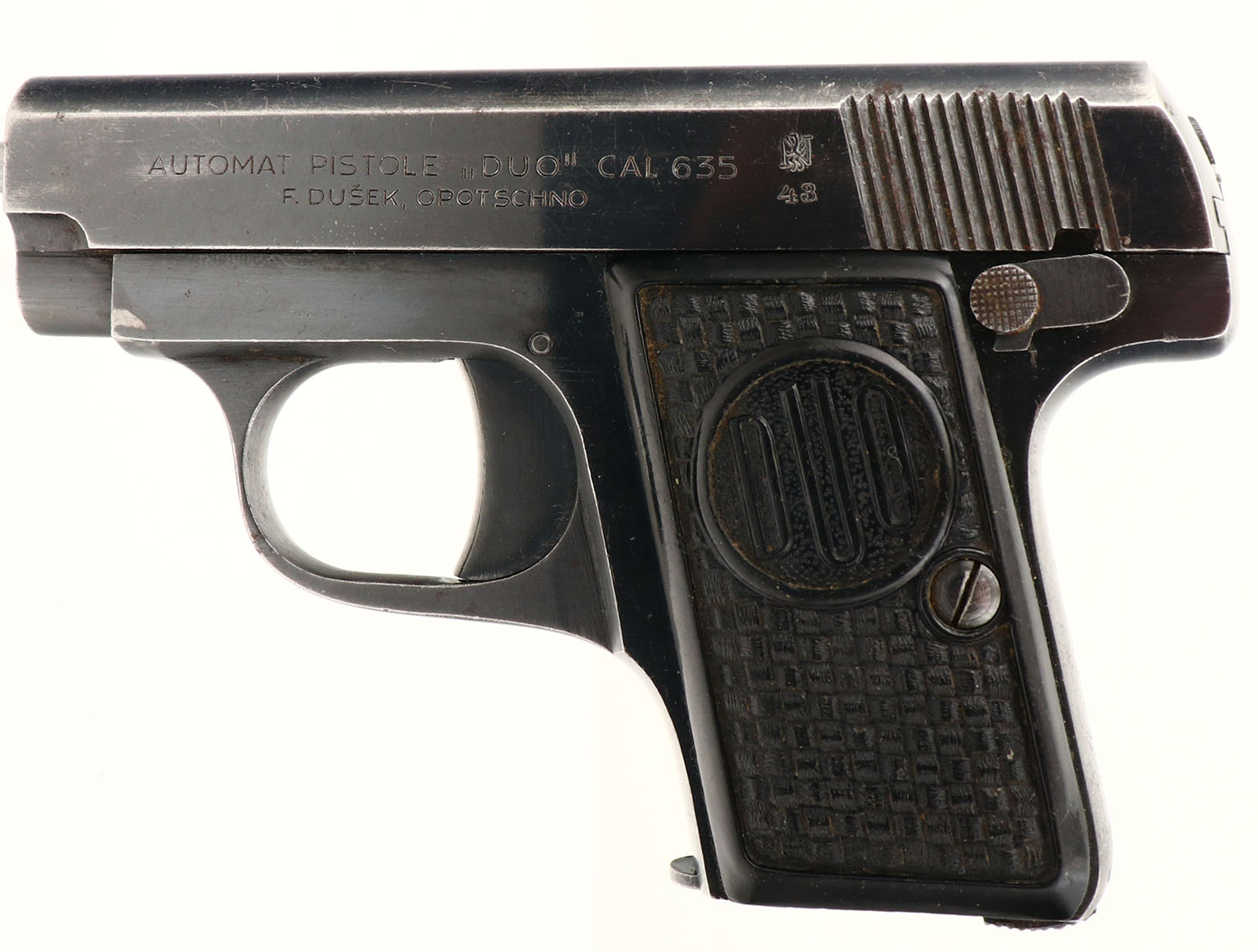 F. Desek, CZ Duo Pistol, 6.35 (.25) Cal., MFG. 1943, SN: 66745, 2'' Barrel, Hammerless single action semi-auto pistol, with detachable magazine. Designed by F. Dusek, but based off of John M. Browning's 1905 pocket pistol. Made in the CZ factory under German management in the WWII era. The original basket woven patterned black plastic grip panels are embossed with ''DUO'' & show almost no wear. The original metal blue finish rates approximately 85%+, with loss due to light scratches & wear at the edges. Grooved sight line. Magazine release at bottom of grips. Left side of slide stamped ''AUTOMAT. PISTOLE ''DUO'' CAL.6.35 / F. DUSEK, OPPTSCHNO''. Slide also stamped with the Prague proof house firing proof & is dated 43. The proof mark is also on the barrel at the ejection port. Comes with one magazine. Bore is excellent. A high quality European pocket pistol. FFL or C&R Req. - Value: 300 to 600