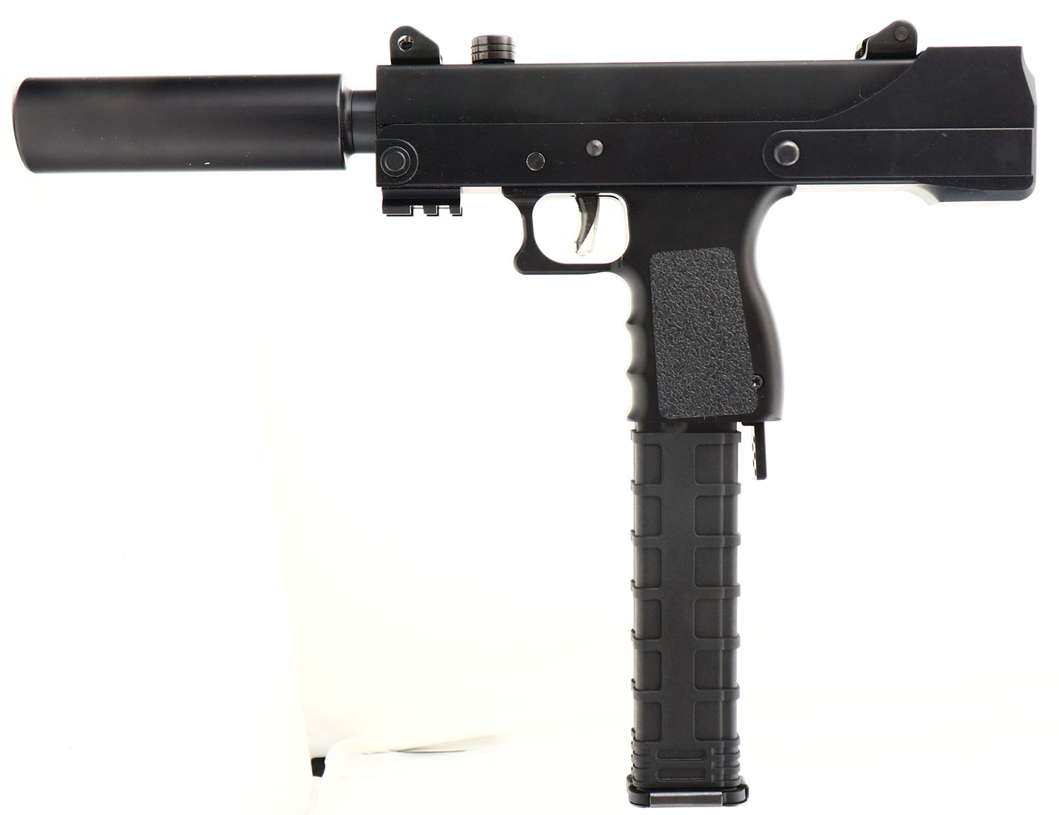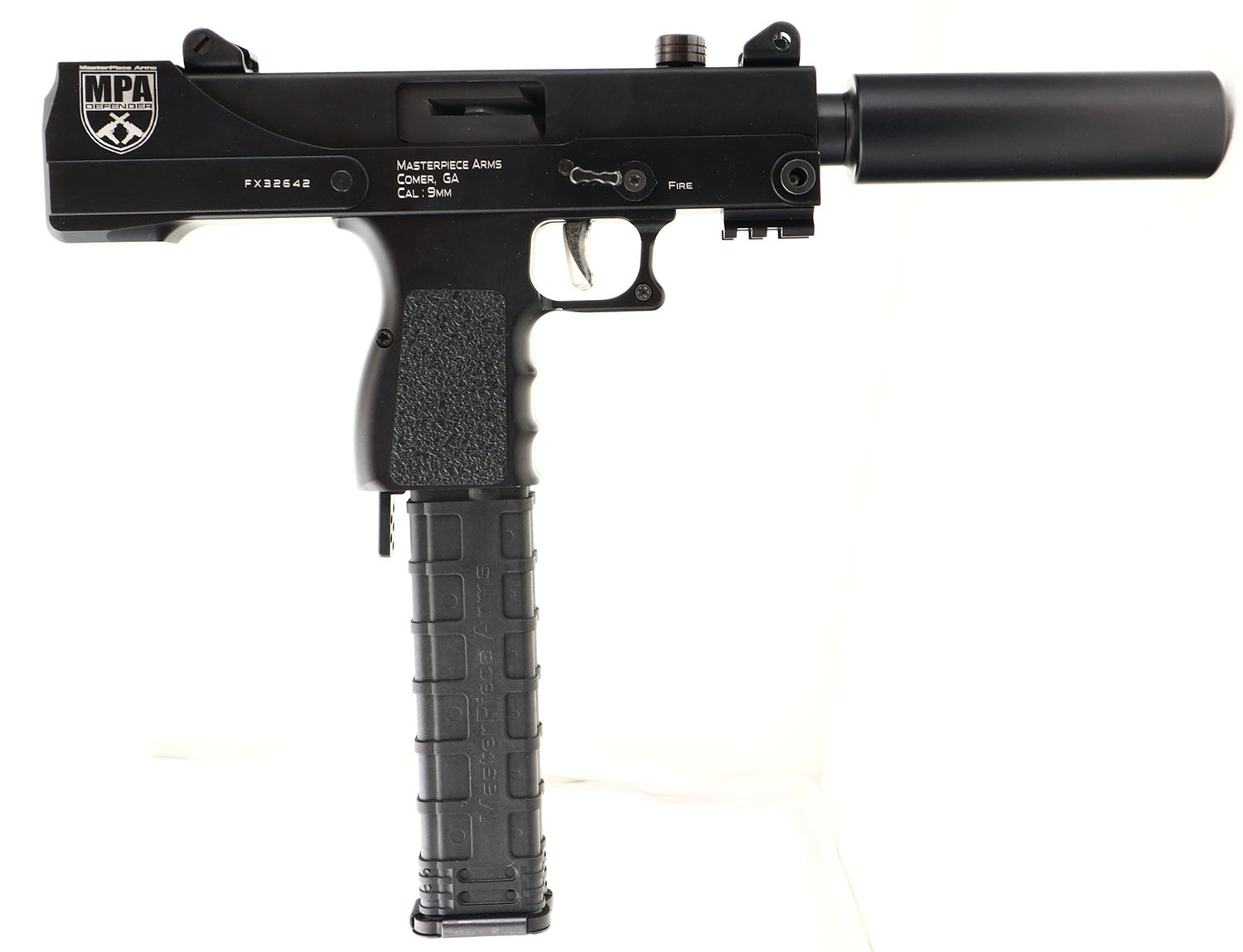Masterpiece Arms, Model ''Defender'', CAL: 9mm, MFG: Modern, SN: FX32642, Semi Auto Pistol, 8 7/8'' threaded barrel. The metal frame with textured pads is excellent. The matte black finish rates 98% overall, with minor scuffs & blemishes. Bore is excellent. Factory sights. FFL Req. - Value: 400 to 700