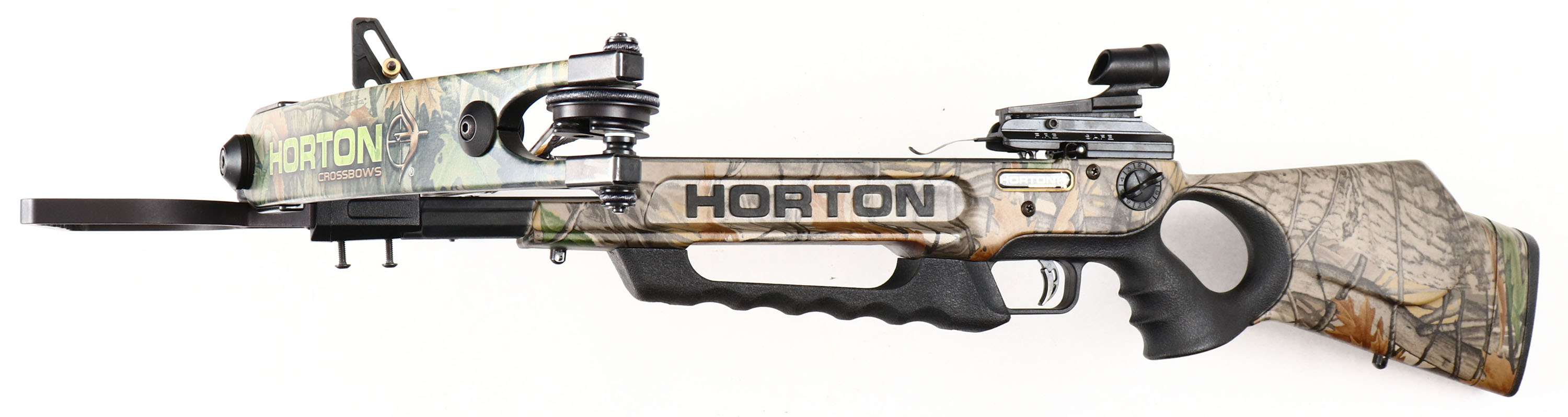 Horton, Model: Legend XL175, Cross Bow, Synthetic camo stock, side post front sight, Elevation adjustable aperture rear sight. Grade: Excellent + - Value: 50 to 300