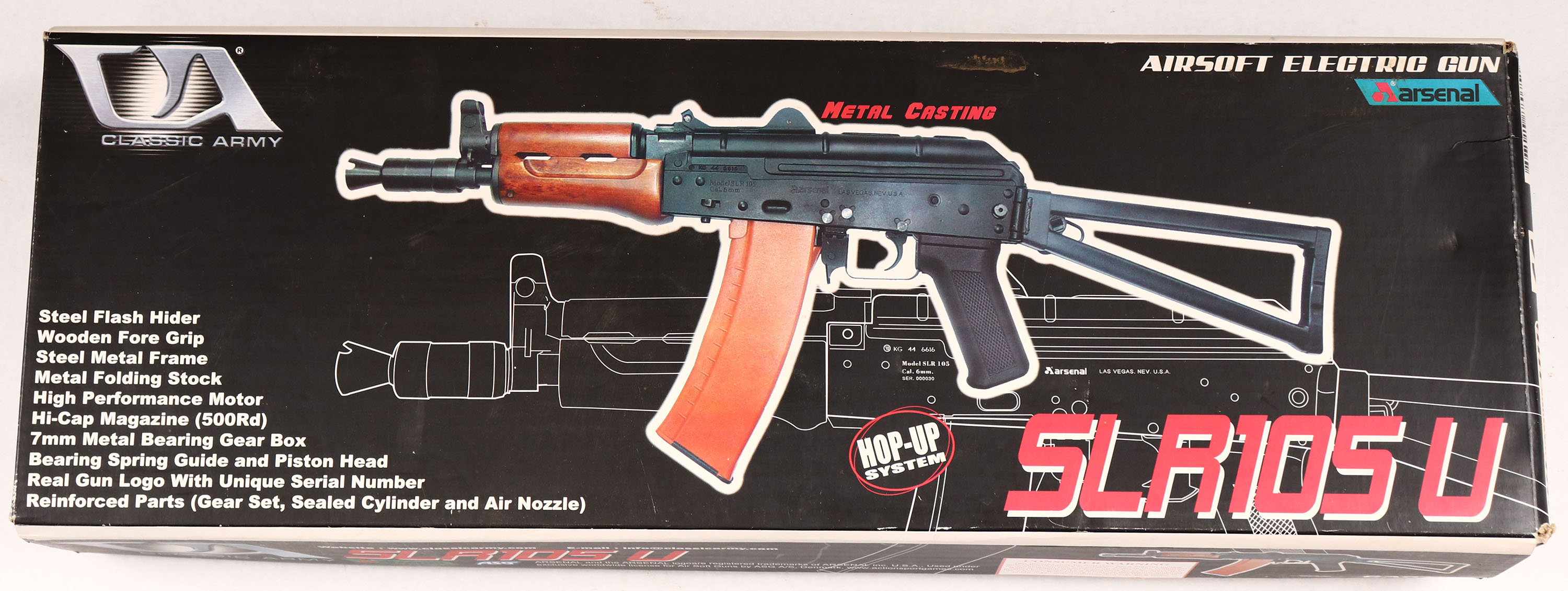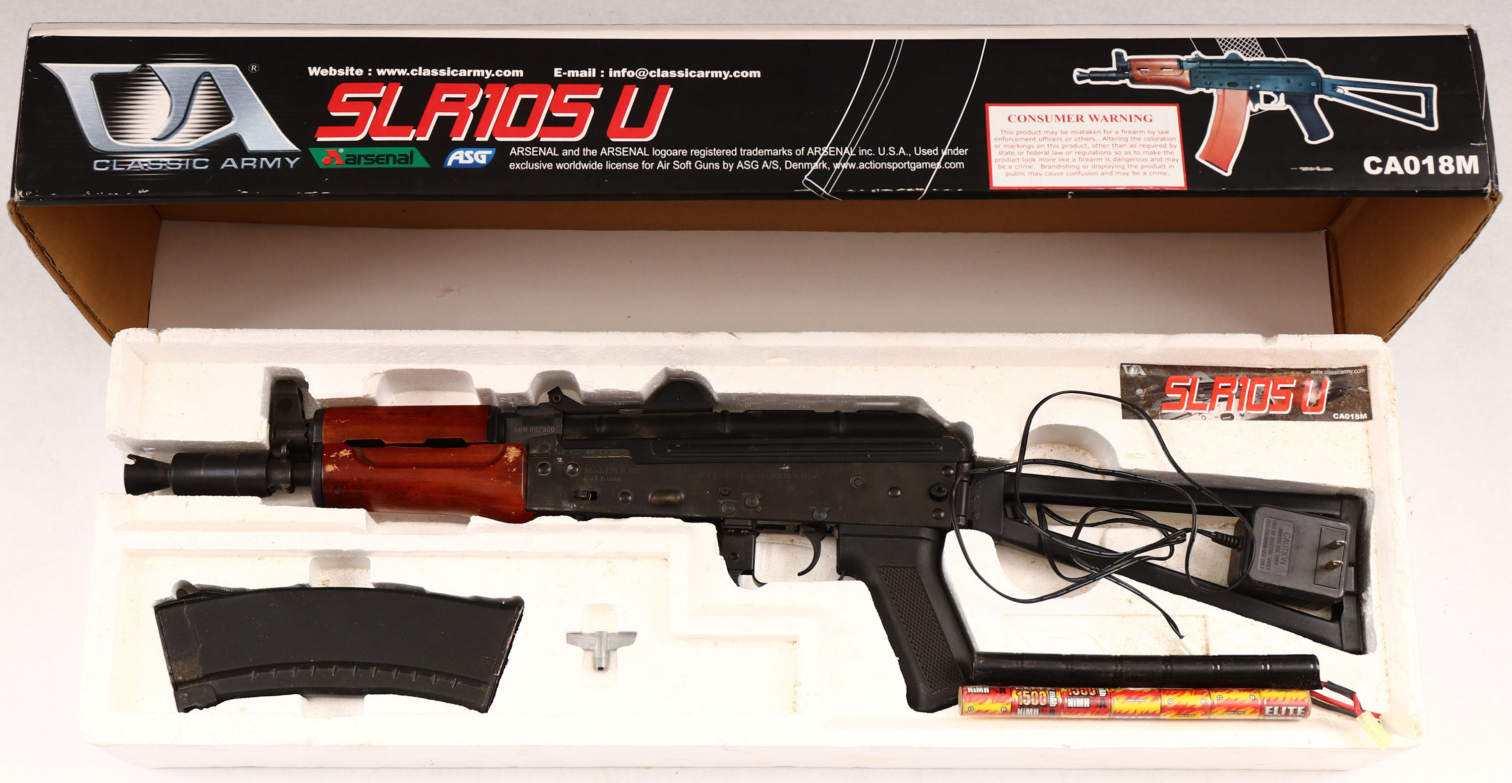 Classic army. Model: SLR 105. Cal: 6mm BB. S/N: 007900. Metal folding stock, plastic pistol grip, wooden forend. Metal finish rates 90% overall with light scratches, comes with mag, two battery's, charger & box. Grade: Excellent - Value: 20 to 60