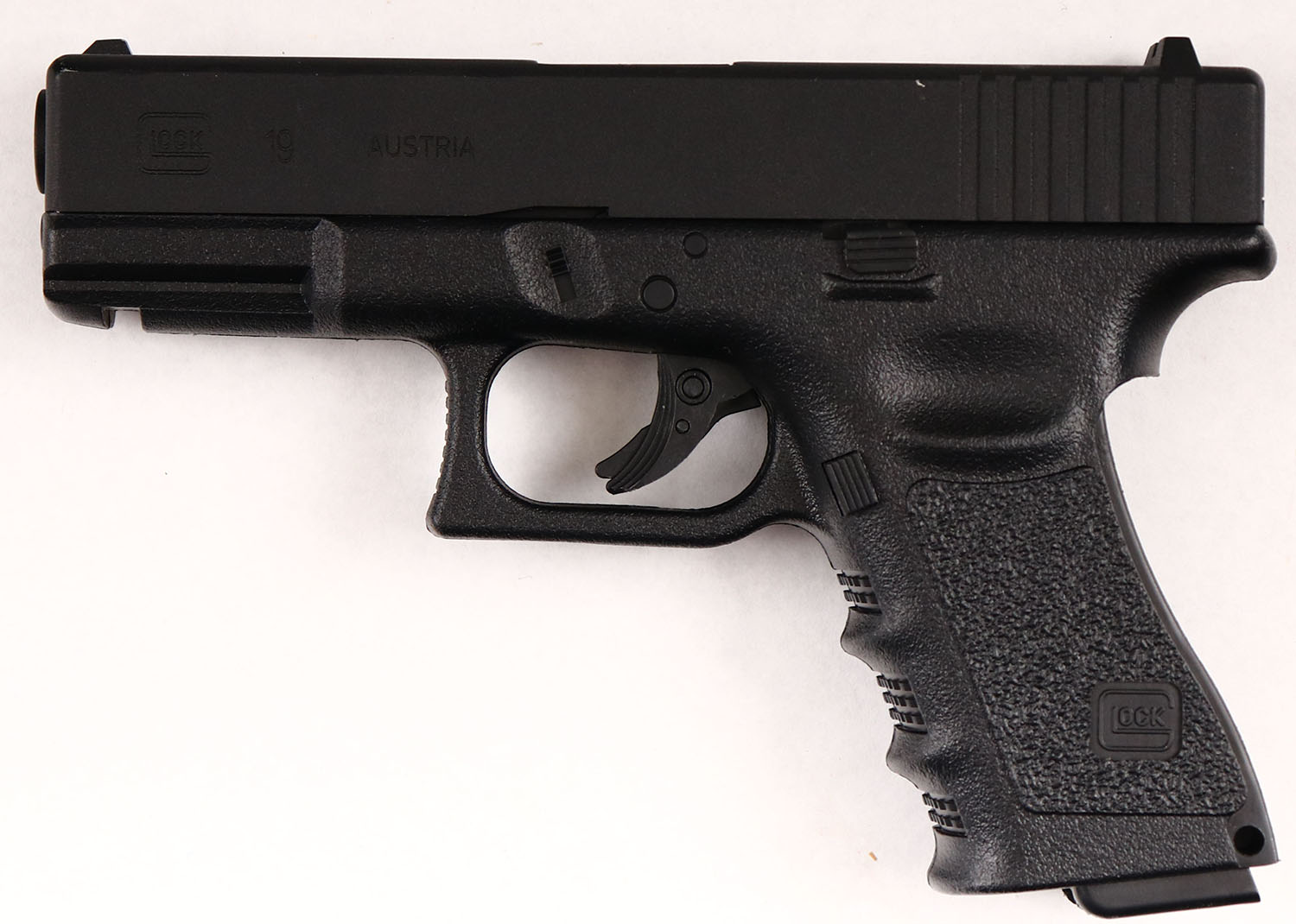 Glock. Model: 19 Co2 BB Gun. Cal: .177 bb. S/N: DA320060. Plastic frame & slide. Missing back plate & magazine. Grade: Very Good + - Value: 20 to 40