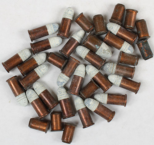 (1) 41 Derringer H/S impressed ''U'' copper case w/ Pt Ld. 32 Short (all copper case): (19) H/S impressed ''H'' RN Ld, (3) H/S impressed ''U'' RN Ld, (12) H/S impressed ''US'' roll crimp blanks. All bullets have light frost. Grade: Very Good - Value: 10 to 60