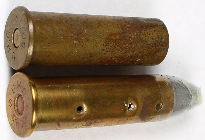 Lot of 2 H/S= '' S U.M.C.H 50-70'' board dummy 2-mounting holes, 1-stab crimp, oval BR. PRL., conical LD. H/S= ''U.M.C. 50-70'' shot STD. CS. Length., oval BR. PRL., buff wad. Grade: Very Good + - Value: 20 to 40