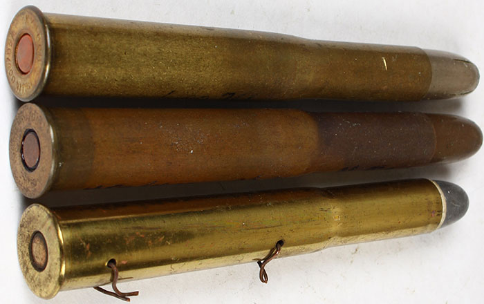 Lot of 3 H/S= ''KYNOCH 450/400 NITRO'', 3 1/4'' C.L. FLT. COP. PRL., F.P. G.M. R.N.- X H/S= ''KYNOCH 450/400 NITRO'', 3 1/4'' C.L. FLT. COP. PRL. S.P. TIN R.N. 4-BLT. Slits. N/H, 450/400 EXPR. Board dummy 3 1/4'' C.L., 4-mounting holes, oval BR. PRL., P.P. R.N.L. COP. Tube. Grade: Very Good + - Value: 20 to 40
