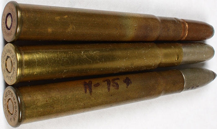 Lot of 3 H/S= ''K Holland 375 Magnum'' 2 15/16'' Flanged, FLT. BR. PRL. F.P. TIN G.M. PTD. TIP. H/S= ''Holland 375 Magnum K,'' 2 15/16 C.L. Flanged, FLT. BR. PRL., S.P. TIN R.N. H/S= ''KYNOCH 375 Magnum''. 2 15/16'' C.L. Flanged, FLT. BR. PRL., S.P. G.M. R.N. 1-R.N. Grade: Very Good + - Value: 20 to 40
