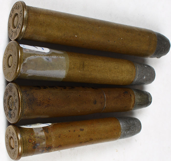 Lot of 4. All brass cases. (1) 45-85 WCF, HS=''U.M.C. S H 45-85'', FN Lead. (1) 40-75 Bullard, HS=''U.M.C. S H .40-75'', FN Lead. (1) 38-45 Bullard, HS=''U.M.C. S H .38-45.'', FN Lead. (1) 38-56 WCF. HS=''W.R.A. Co. .38-56 W.C.F.'' . 'w' on brass primer, FN Lead. Condition Very Good - Value: 40 to 100