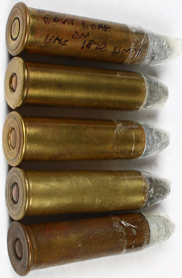 Lot of 5 (3) N/H, 50-70 (U.M.C. M.F.G.) HD. Ring, oval COP. PRL., conical LD. (1) N/H, 50-70 board dummy, 2-CS. Holes, 1-stab crimp, HD. Ring, oval BR. Berdan PRL., conical LD. (1) N/H, 50-70 (U.M.C. M.F.G.) HD. Ring, BR. Berdan PRL., conical LD. Grade: Very Good ++ - Value: 20 to 50