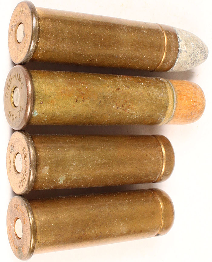 Lot of 4 (1) H/S= ''REM-UMC 50-70'' FLT. NIC. PRL., 1-CNN., conical LD. (1) H/S= ''REM-UMC 50-70''. Oval tin PRL. - shot - wood sabot (2) H/S= ''REM-UMC 50-70'', FLT. NIC. PRL., 1-CNN. - shot - 1 red wad and 1-tan wad 1/4. Grade: Excellent - Value: 20 to 40