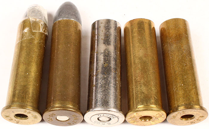 Lot of 5 H/S= ''D.C.CO. 50-70 new empty NIC. CS., H/S= ''walt's 50-70'', FLT. NIC PRL., F.N.L. H/S= ''D.G.W 50-70'', No PRL. Conical LD. H/S= ''50-70 D.G.W.'' large letters, new empty CS. H/S= ''D.G.W. 50-70 small letters, new empty CS. Grade: Excellent - Value: 20 to 40