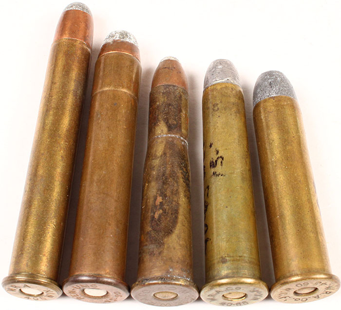 Lot of 5. All brass cases. (1) 40-65 WCF H=''W.R.A. CO. 40-65 W.C.F.'', FN Lead. (1) 405 Winchester. HS=''WRA 405 WIN'' RN copper jacket SP. (1) 38-56 WCF HS=''W.R.A.CO. 38-56 W.C.F.'', RN copper jacket SP. (1) 45-60 WCF HS=''W.R.A.CO.'', FN Lead. (1) 45-90 WCF HS=''REM-UMC 45-90'' Copper jacketed flatnose softpoint. Conditions Very Good - Value: 20 to 40