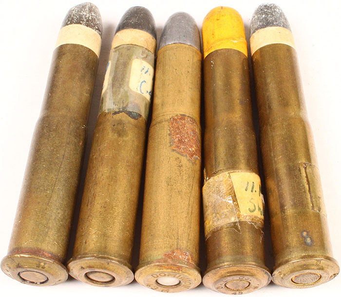 Lot of 5. 11mm Mauser. All brass cases. (3) German Military 71/84 cartridges. HS#1=''D 7 87 *'', HS#2=''B&S 1878 II'', HS#3=NHS, (1) 11mm Mauser Shot HS=''D.C.Co. 43 M'', Yellow paper shot tube. 1mm Mauser commercial Ball HS=''DOMINION 43 M''. RN Lead. Condition Very Good - Value: 20 to 40