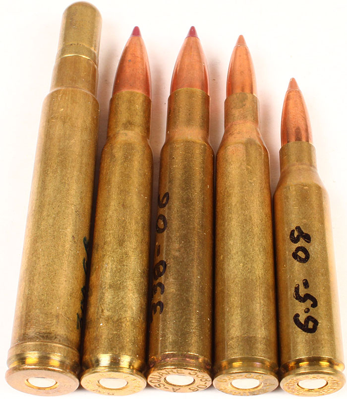 Lot of 5 H/S= ''A - square 375 WTHBY'' FLT. NIC PRL., F.P. BR. R.N. belted H/S= ''NORMA 338-06 A-SQ.'' FLT. NIC. PRL. S.P. G.M. red poly-tip. H/S= ''A - square 338-06'', FLT. NIC PRL. S.P. G.M. red poly-tip. H/S= ''A - square 6.5-06'', FLT. NIC. PRL. S.P. G.M. salmon colored poly-tip H/S= ''A - square 6.5-08'' FLT. NIC. PRL. S.P. G.M. brown poly-tip. Grade: Excellent - Value: 20 to 40