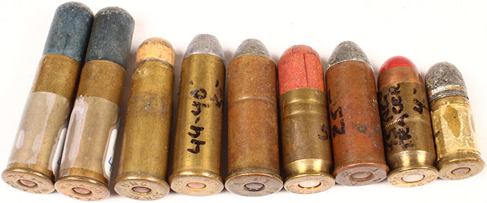 Lot of 9. Mixed. (1) 45 Auto Tracer HS=''REM-UMC 45 ACP'', FMJ w/ red tip. (1) 45 Auto Shot HS=''PETERS 45 AC'' Red fiber shot tube & double case cannelures. (2) 44XL Shot HS=''W.R.A.Co. .44 X.L.'', blue fiber shot tube. (1) 44-40 WCF HS=''PETERS 44-40'' , FN Lead. (1) 45 Colt Mdl 1909 HS=''F A 12 11''. FN Lead. (1) 45 S&W Schofield HS=''R 7 83 F'', copper case, FN Lead. (1) .410 Revolver HS=''ELEY LONDON'', RN Lead. Condition Very Good - Value: 20 to 40