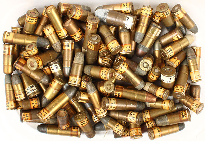 Lot of 102 Revolver cartridges--all by United States Cartridge Co. Calibers from 32 short colt to 45 auto rim. Various bullet loadings including shot and blanks. Condition Very Good - Value: 40 to 100