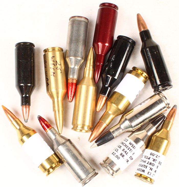 Lot of 13 (5) H/S= ''Winchester 25 WSSM'' SPL. Purpose loads: BLK. CS. Function dummy tin CS. Proof diff. BL'T. variations (6) H/S= ''Winchester 223 WSSM'' SPL. Purpose loads, tin CS. Proof., BLK. CS. Function dummies, diff. BL'T. variations (1) H/S= A-zoom 223 WSSM, Magenta colored CS. & BL'T. (1) H/S= ''FC - 223 WSSM'' BR. CS. By Olin. Orange poly-tip. Grade: Excellent + - Value: 20 to 50