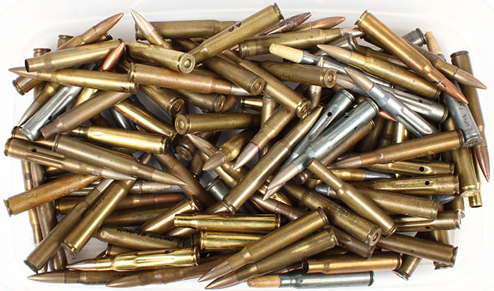Collection of 112 U.S.C.CO. 30-06 military contract, (7) TIN CS. Blank paper B'T'S. (6) TIN CS. Fluted 3-CS. Hole dummies (9) BR. CS. Fluted 3-CS. Hole dummies (62) BR. CS. Ball loads, (18) BR. CS. Blanks (10) BR. CS. S.P. sporting loads, a mix of PRL. Types with many dated H/S. Grade: Very Good + - Value: 40 to 80