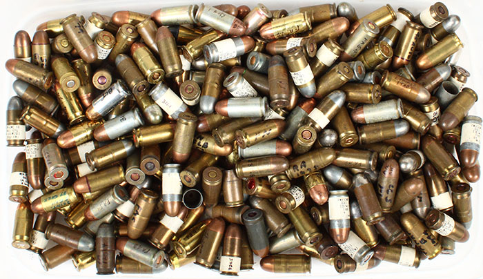 Large collection of Roughly 200 RNDS. .45 ACP. All diff. variations, very early MFG. to more recent, many SPL. Purpose samples, foreign MFG'S. STD & full length C.S.'S. brass & tin CS. Flutted, show souvenir's, movie dummies, target loads, steel cases, match loads, sub sonic, anti ballistic, metal piercing, alum alloy cases, early hard to find military contract dates and much more. Grade: Very Good + - Value: 100 to 300
