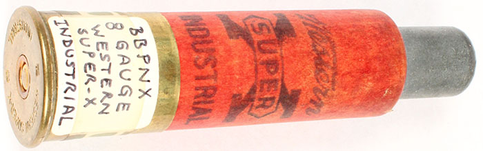 H/S: Western Super-x No 8 industrial, loaded shotshell, red paper case 3 7/8'' OAL. Grade: Excellent - Value: 4 to 30