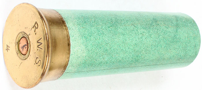 NPE, H/S: R.W.S, teal paper case, 4 ga, 3 3/16'' OAL. Grade: Excellent - Value: 10 to 100