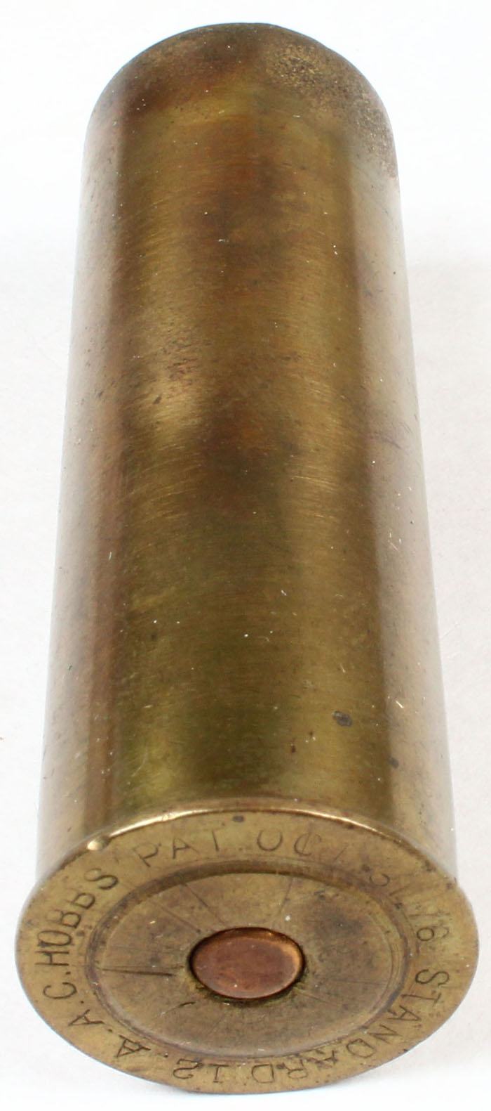 H/S: A.A.C. Hobbs Pat Oct 31.76, standard 12 ga, 2 9/16'' OAL. empty brass shotshell. Grade: Very Good ++ - Value: 10 to 50