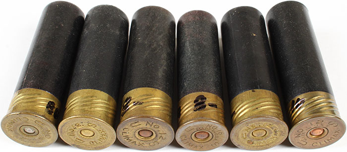 Lot of 6 loaded paper shotshells. Grade: Excellent - Value: 10 to 100