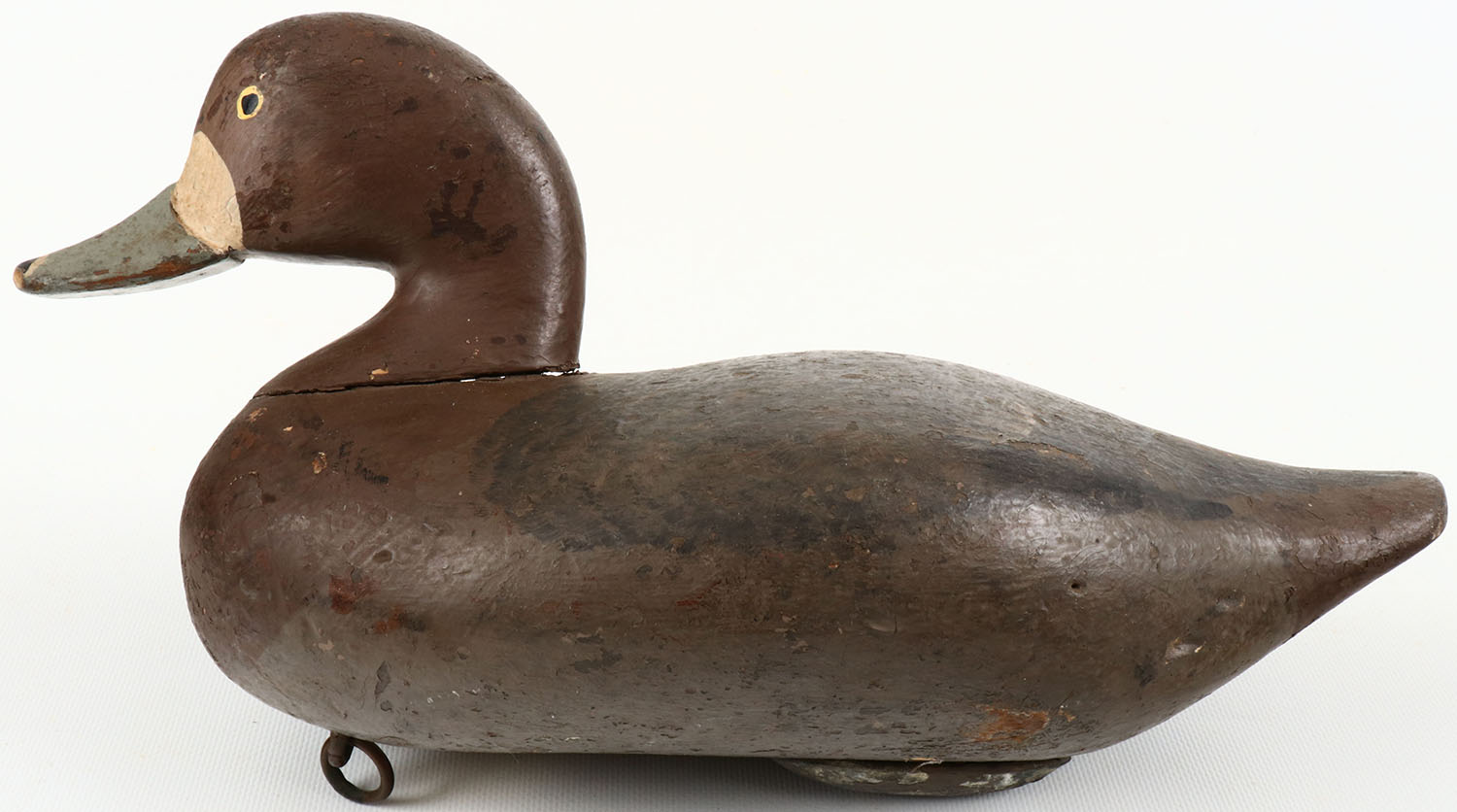 Bluebill Hen by R. Madison Mitchell, Havre De Grace, MD. Circa 1945, painted eyes, solid wood, original paint with light wear, lead weight on bottom. Grade: Excellent - Value: 200 to 350