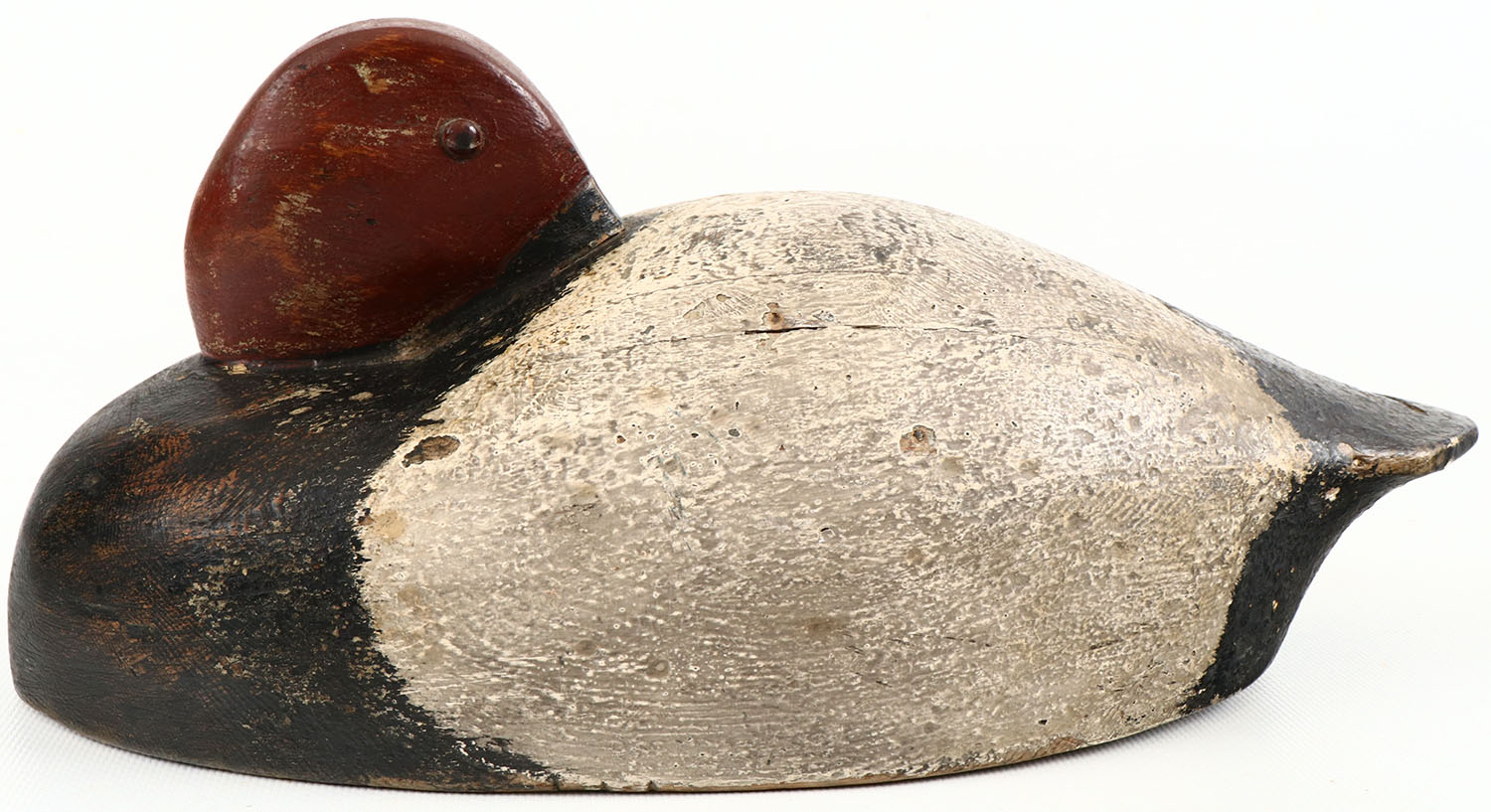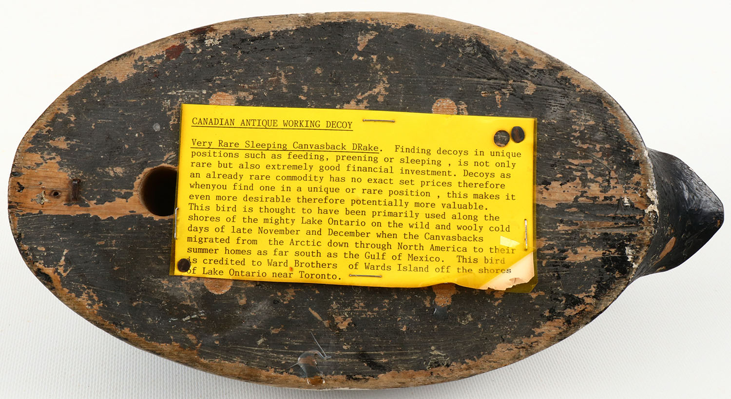 Very Rare Sleeping Canvasback Drake. Glass eyes, solid wood, original paint, some edge wear, Canadian Antique Working Decoy, This bird is thought to have been primarily used along the shores of the mighty Lake Ontario on the wild and wooly cold days of late November and December when the Canvasbacks migrated from the Arctic down through North America to their summer homes as far south as the Gulf of Mexico. This bird is credited to Ward Brothers of Wards Island off the shores of Lake Ontario near Toronto. Grade: Excellent - Value: 300 to 550
