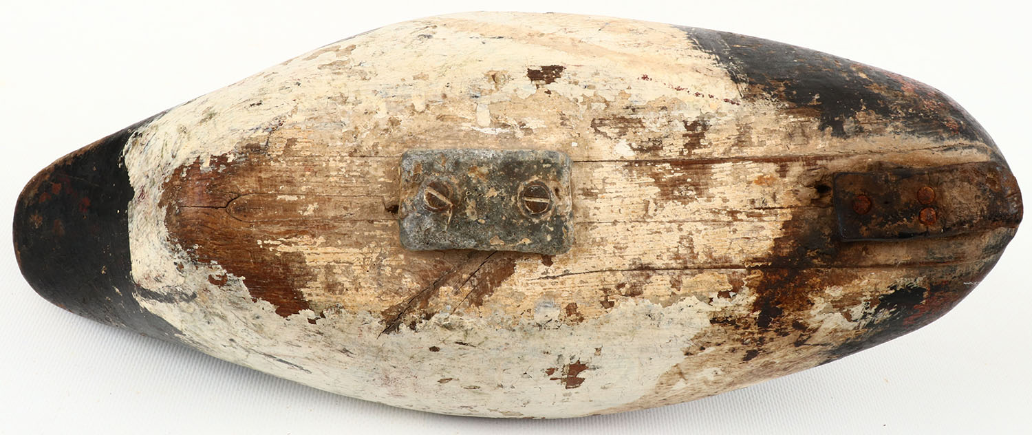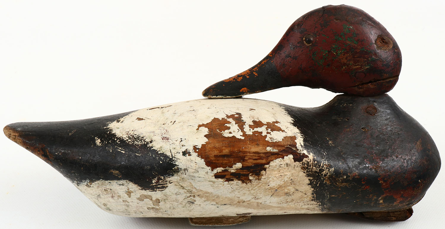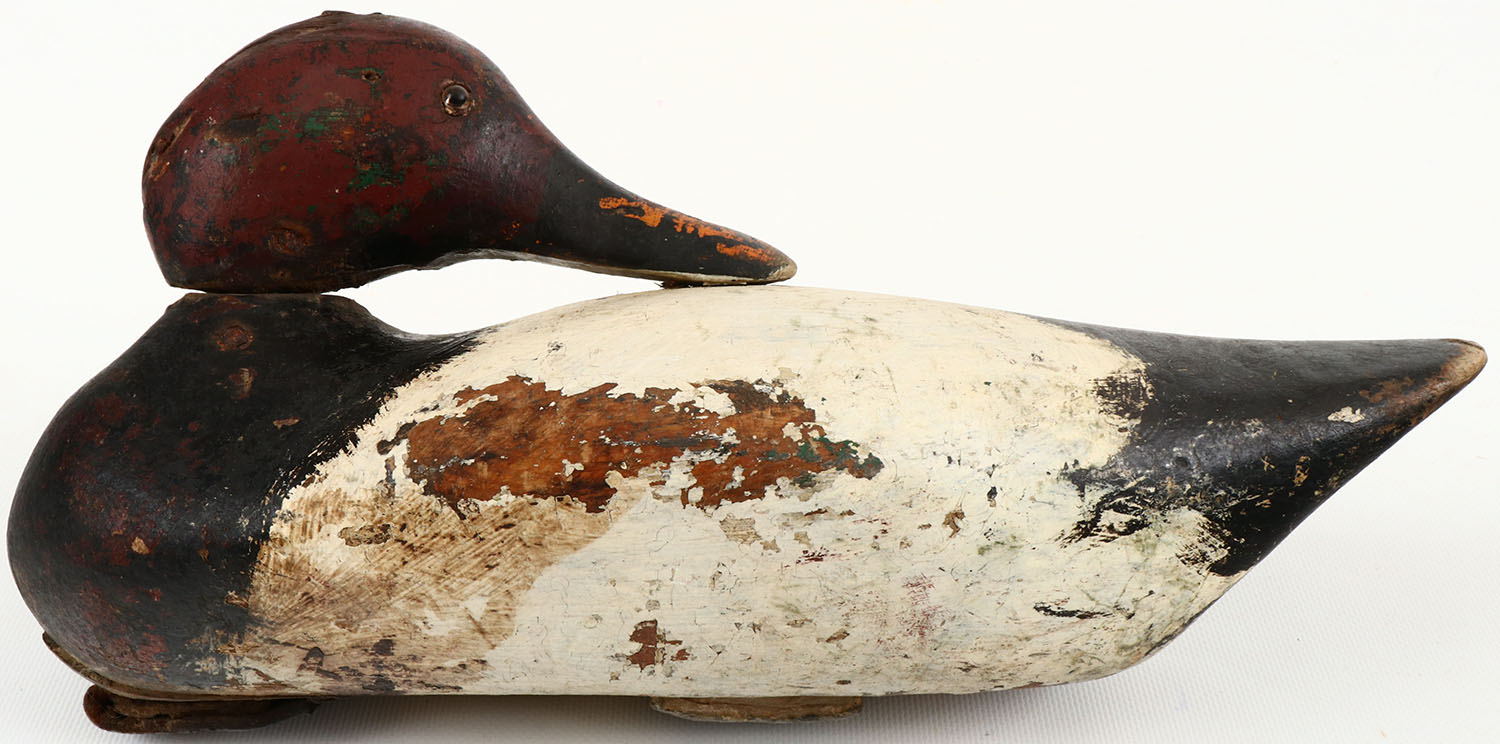 Canvasback Drake. Appears to be the Dodge Decoy Factory, Detroit, MI. glass eyes, solid wood, repaint with crack in head, neck filler is missing, lead weight on bottom. Grade: Good - Value: 70 to 150