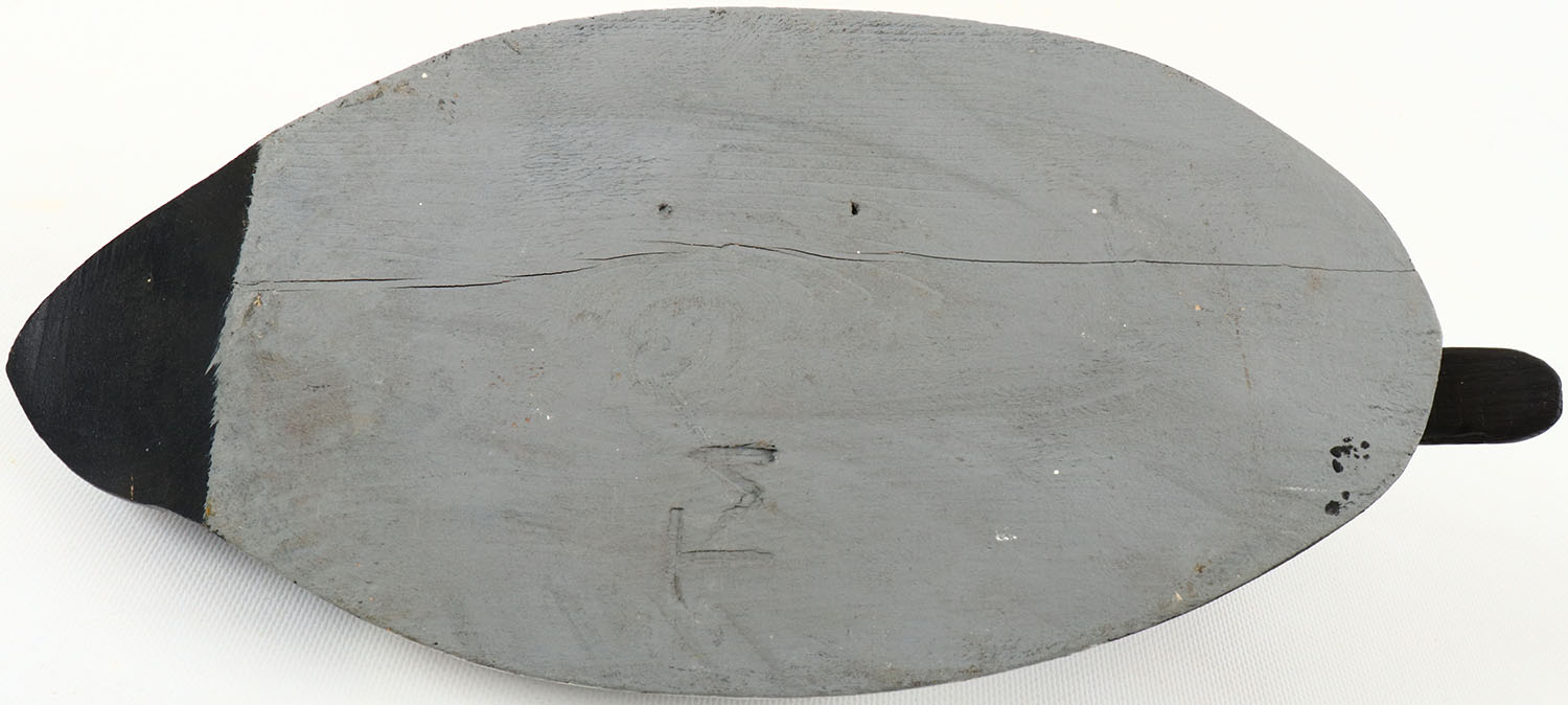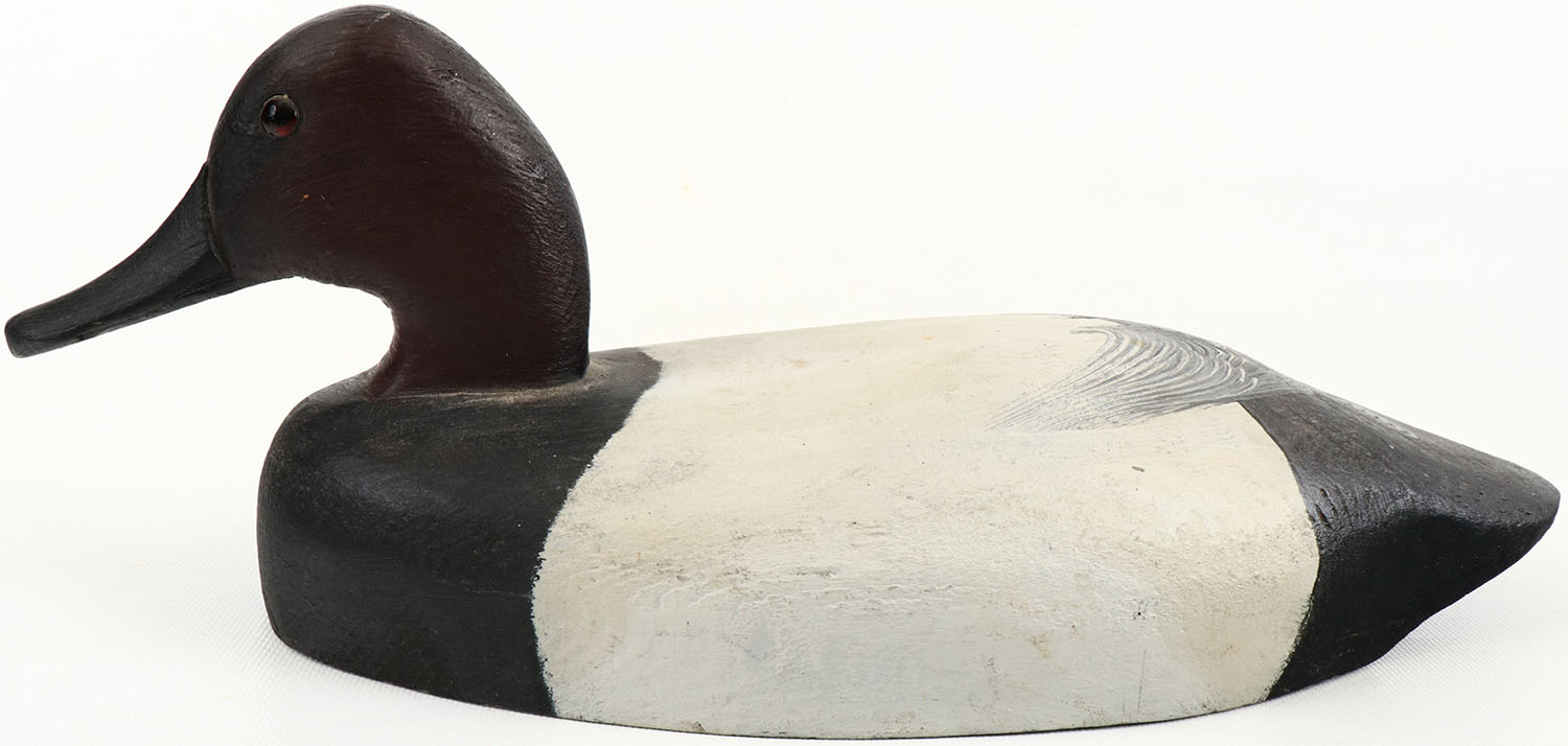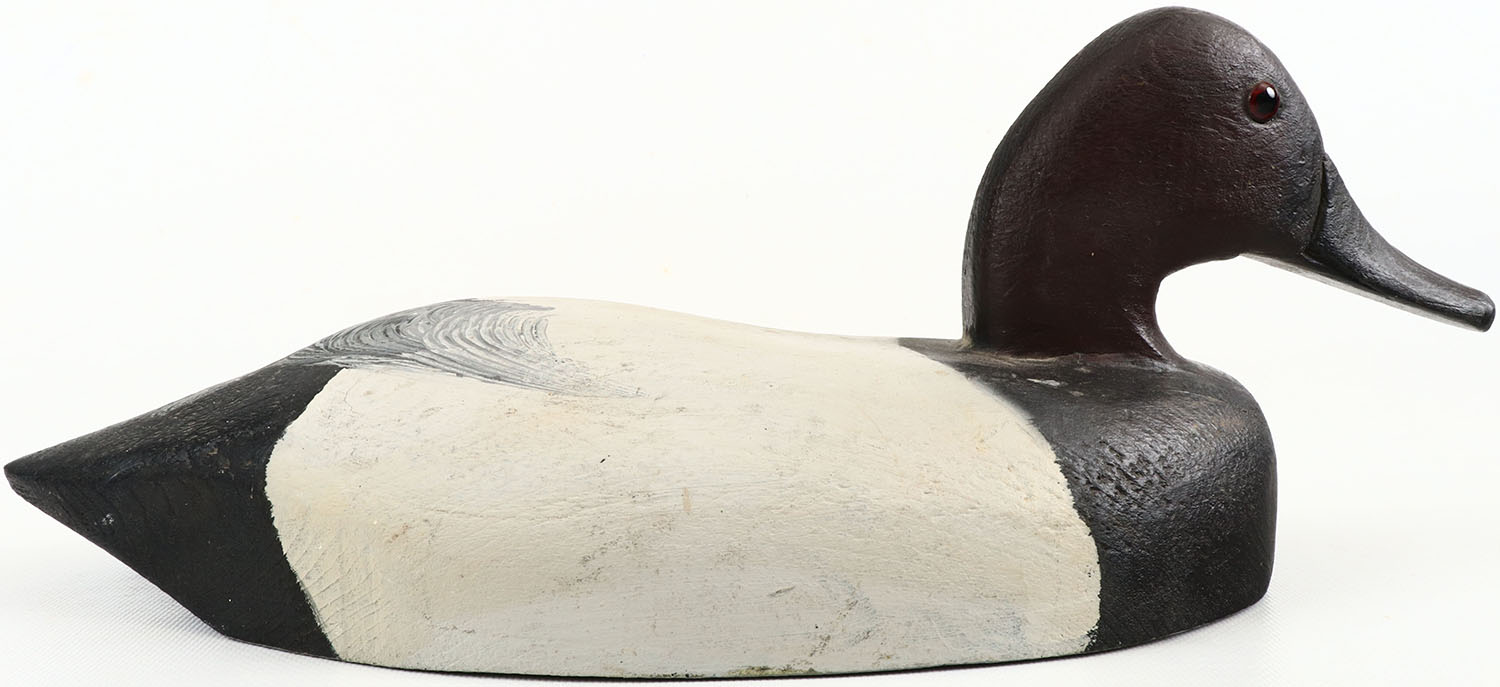 Canvasback Drake by unknown maker, glass eyes, solid wood, mint original paint, structurally excellent, branded TM on bottom.. Grade: Excellent + - Value: 40 to 150