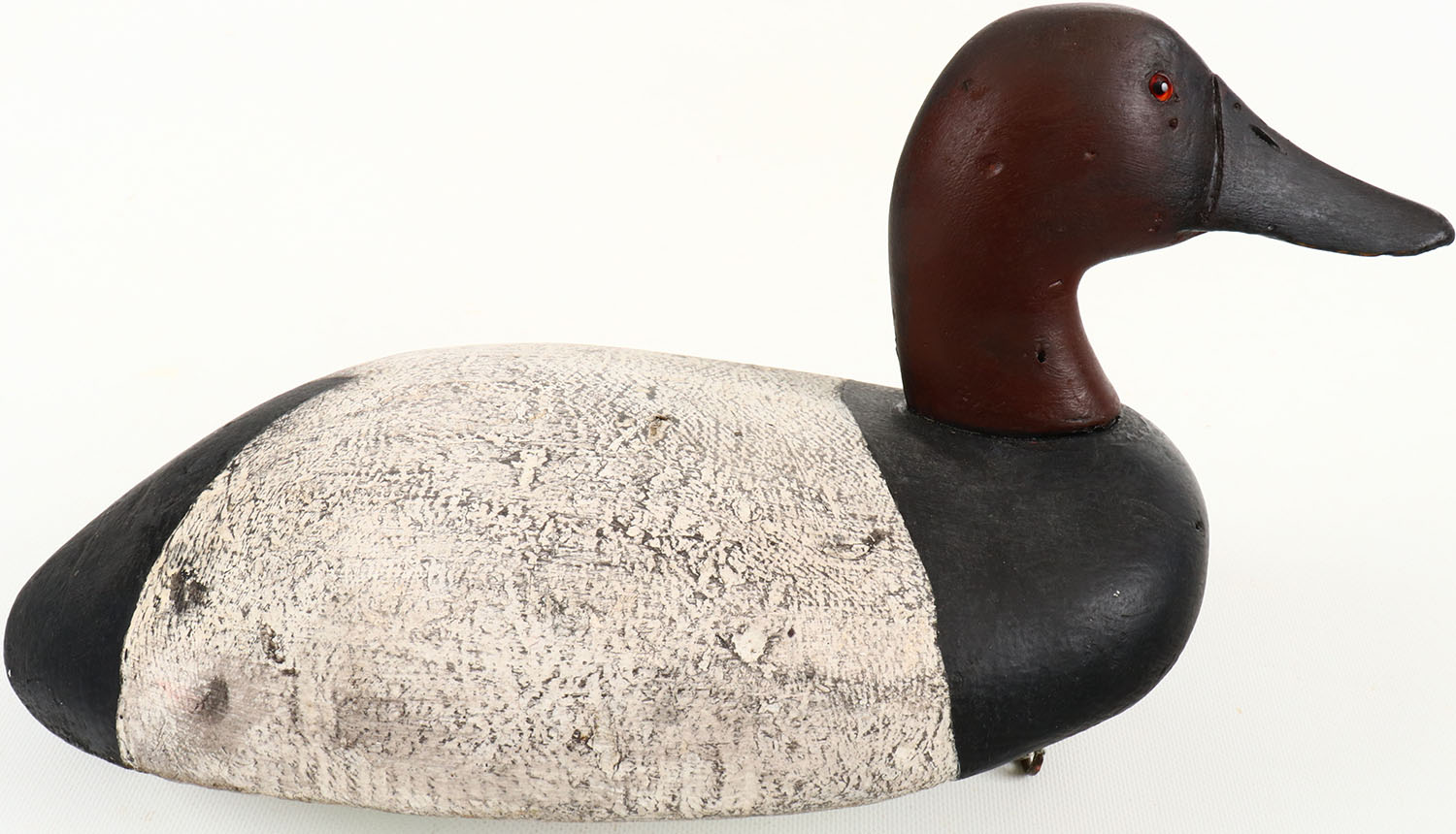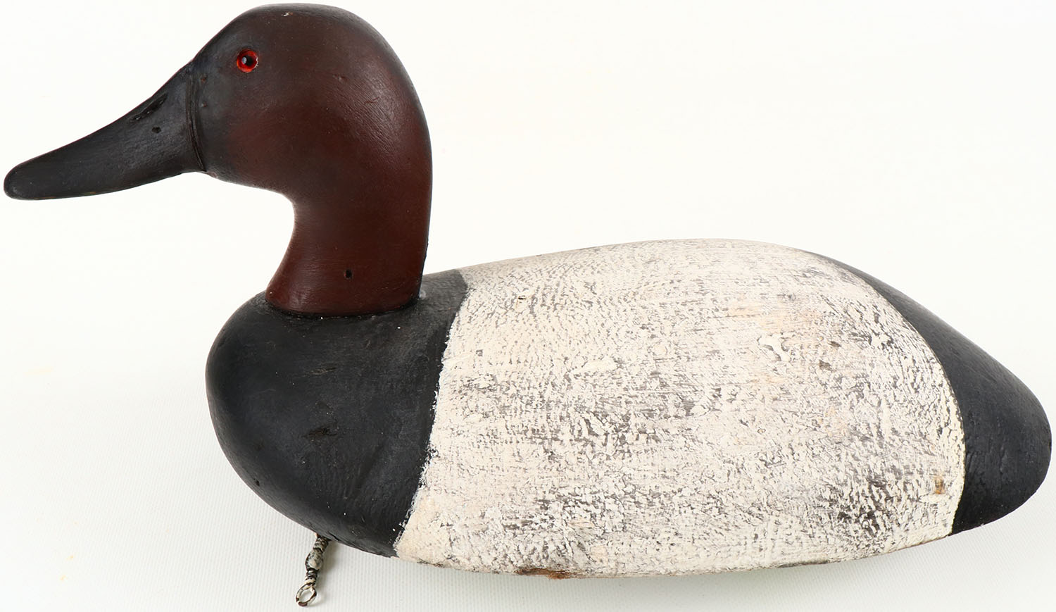 Canvasback Bobtail Drake by Joe Lafferty at Martin's Lane Lasalle, Ontario 1930's, glass eyes, solid wood, excellent original paint, structurally excellent, lead weight on bottom. Grade: Excellent + - Value: 40 to 150