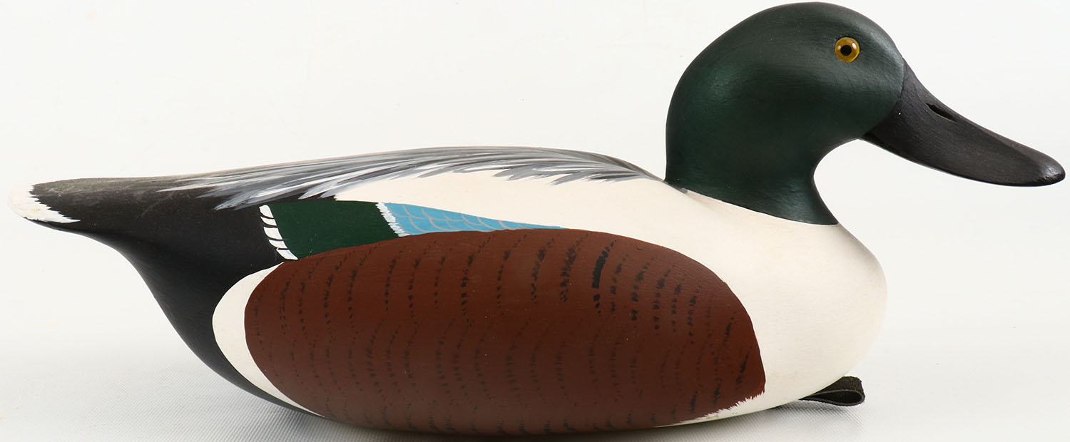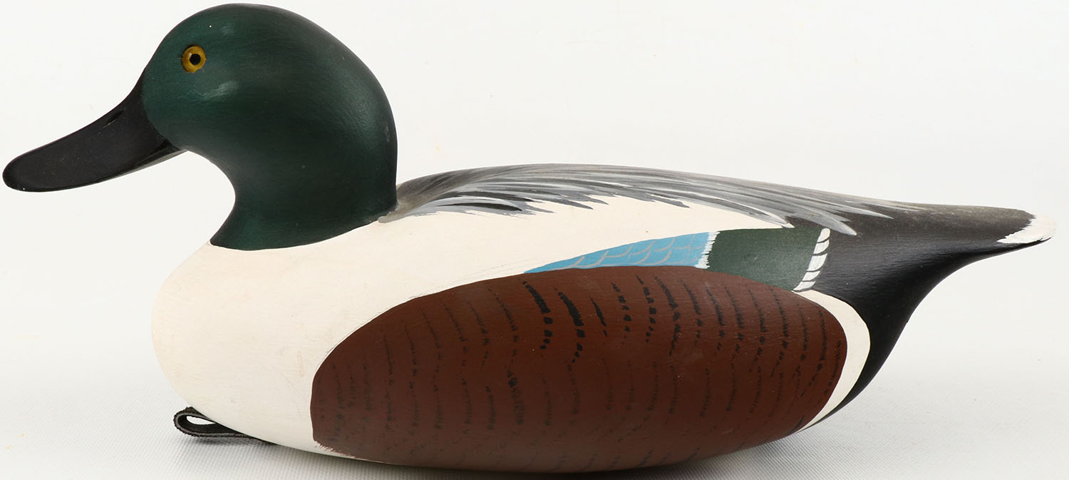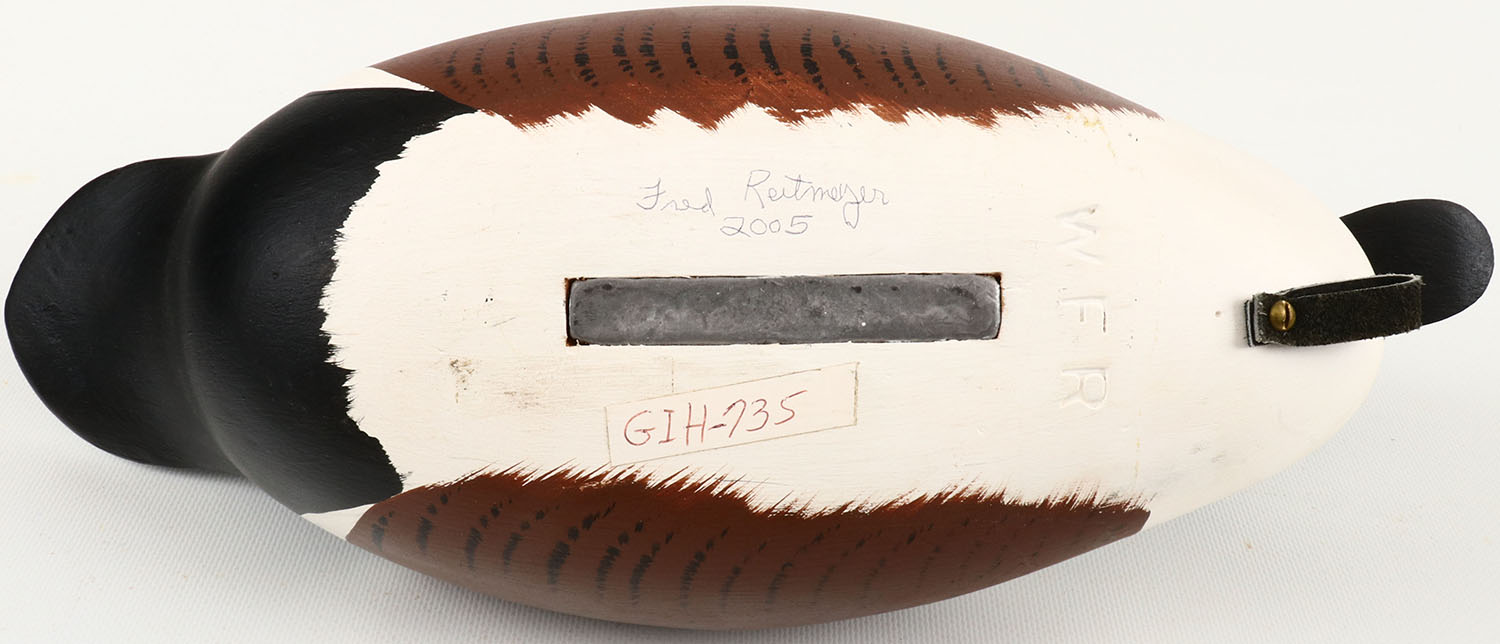 Spoonbill Drake by Fred Reitmeyer, glass eyes, structurally excellent, hollow wood, excellent original paint, has branded WFR on bottom. Grade: MINT - Value: 40 to 150