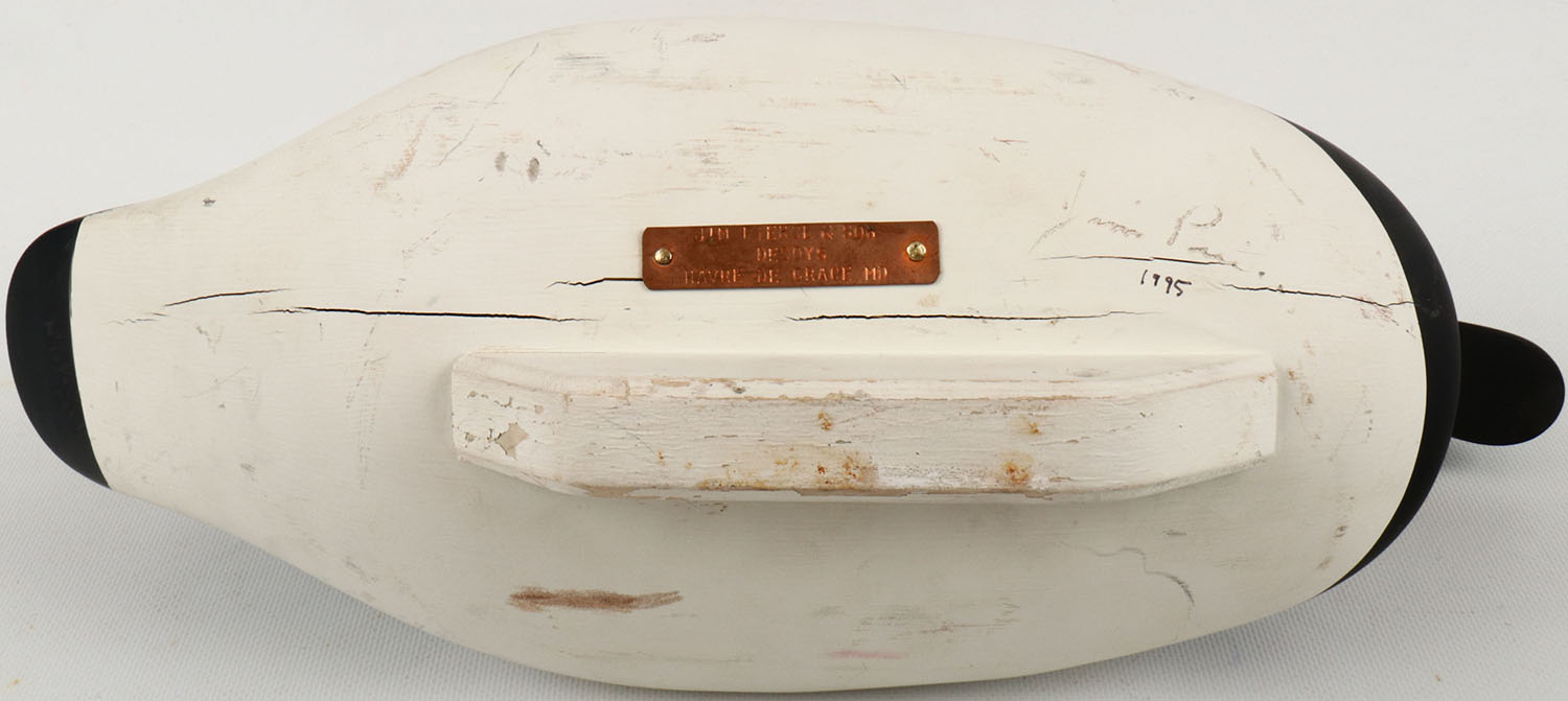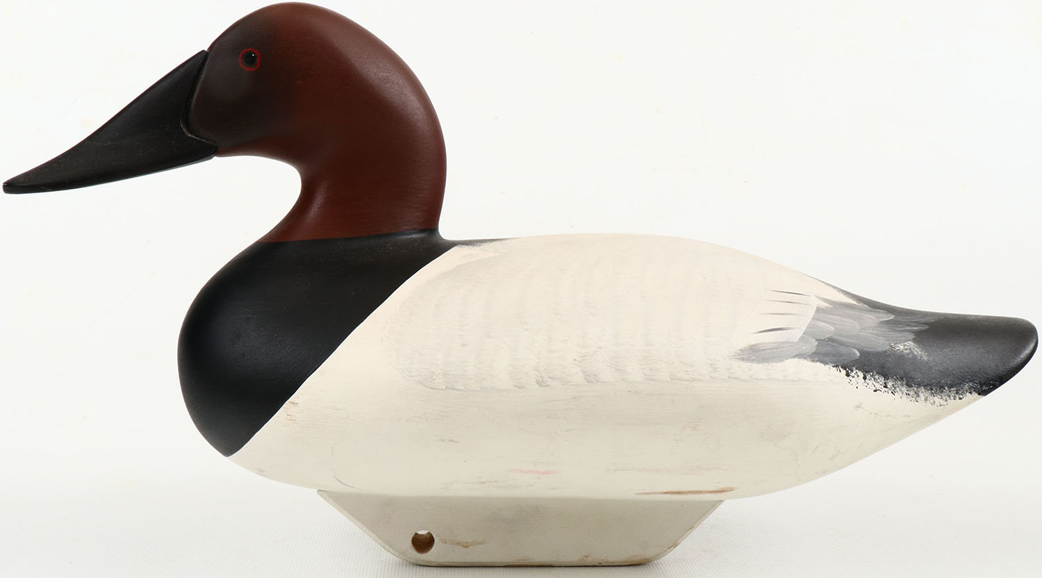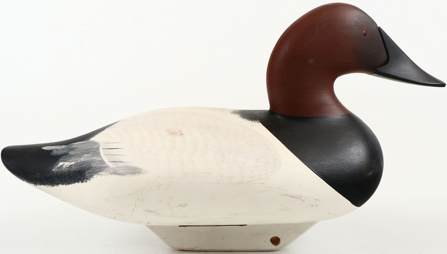 Canvasback Drake by Jim Pierce & Son Decoys, Havre de Grace, MD, painted eyes, structurally excellent, solid wood, excellent original paint. Grade: Excellent ++ - Value: 40 to 150