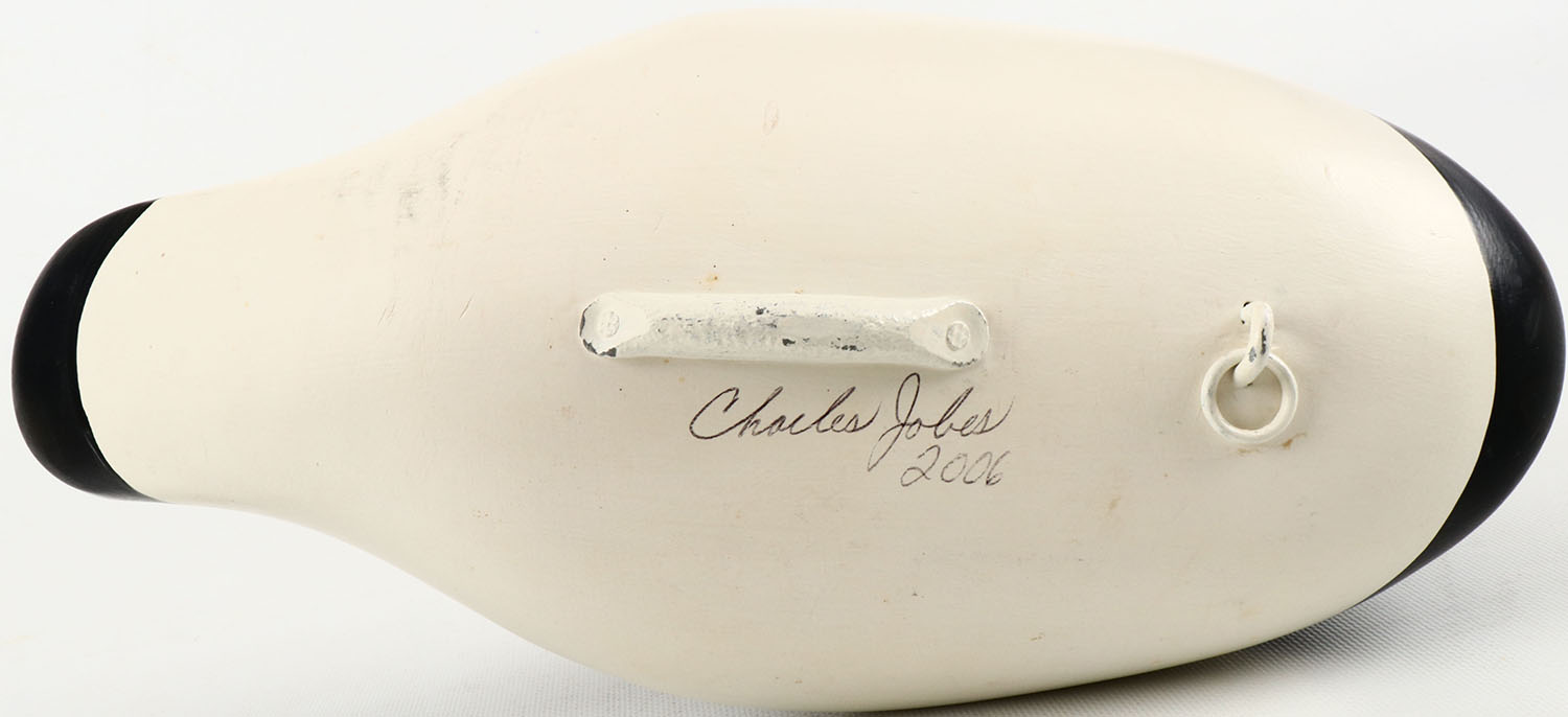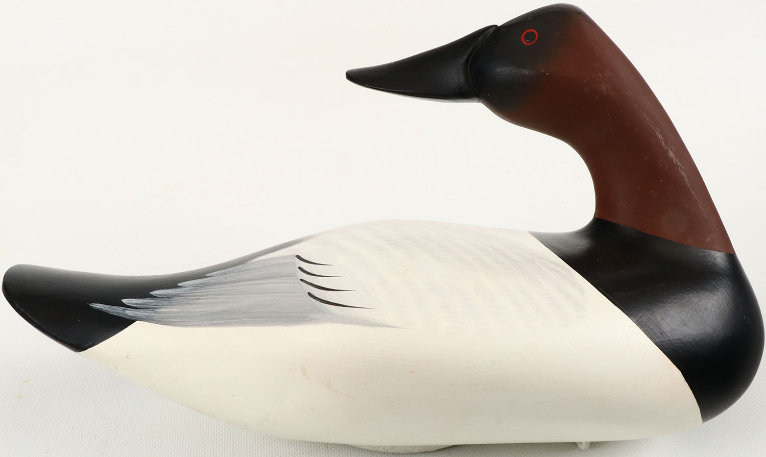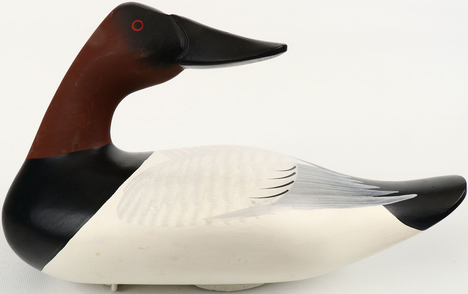 Turned Head Canvasback Drake by Charles Jobes, MD, painted eyes, structurally excellent, solid wood, excellent original paint, signed on bottom. Grade: MINT - Value: 40 to 150