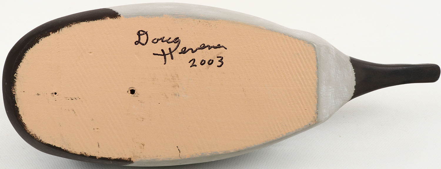 Old Squaw Drake, by Doug Hevener ? glass eyes, structurally excellent, solid wood, excellent original paint, signed on bottom. Grade: Excellent ++ - Value: 40 to 150
