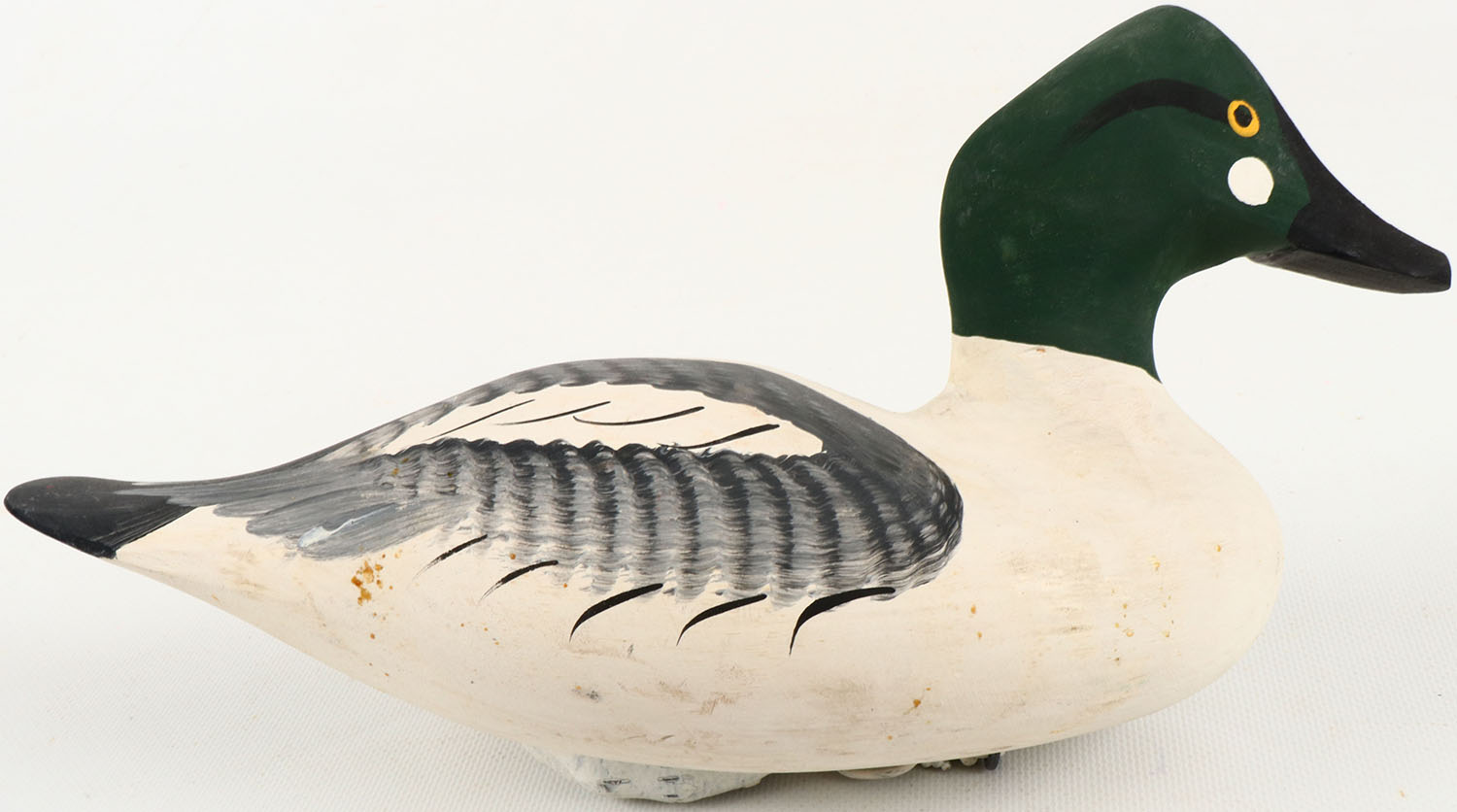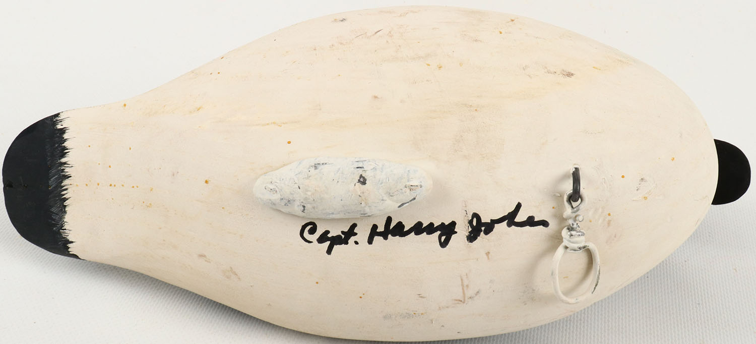 Goldeneye drake by Capt. Harry R. Jobes, Havre de Grace, MD, solid wood, painted eyes, mint original paint, has hair line crack to left side of body, bottom is signed. Grade: Excellent - Value: 40 to 150