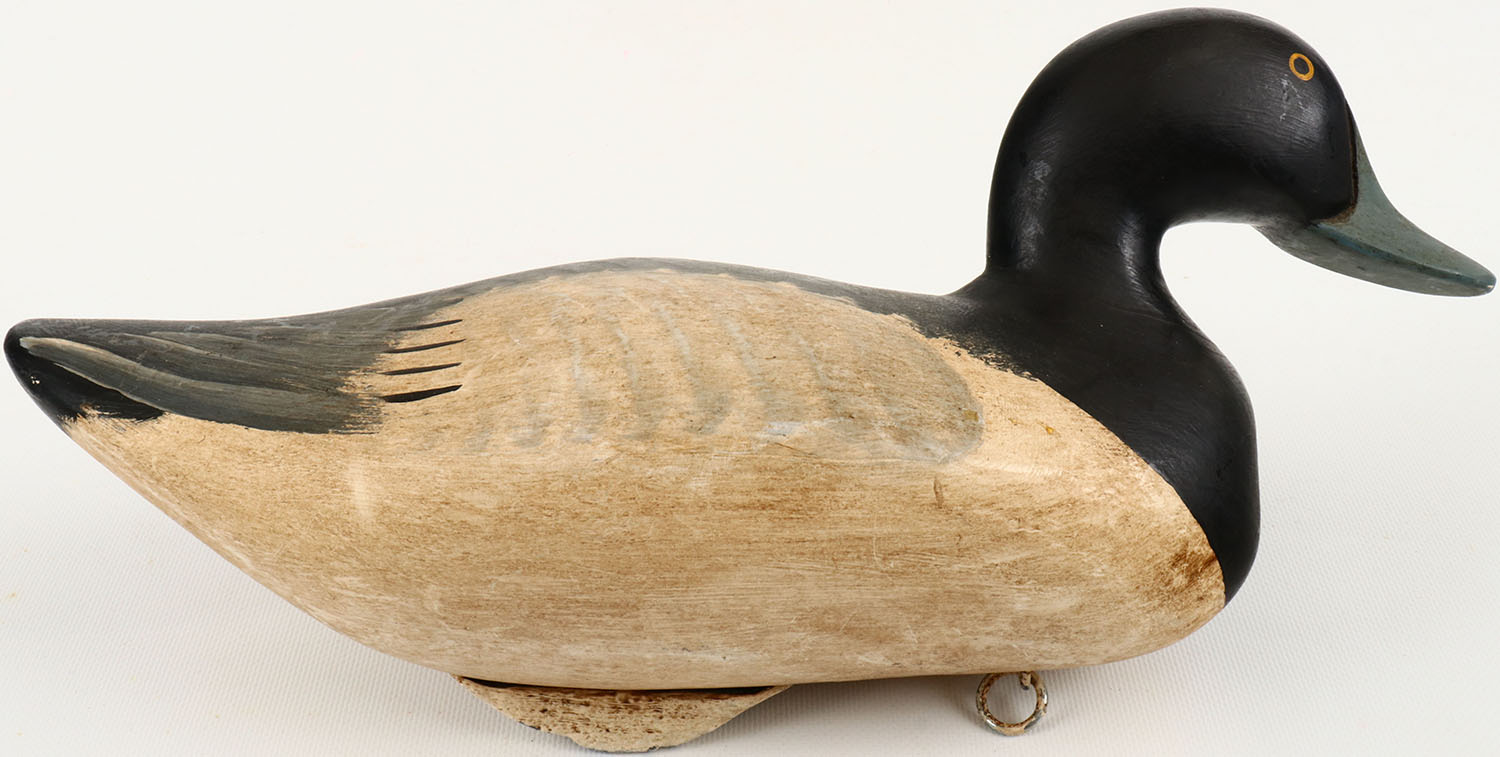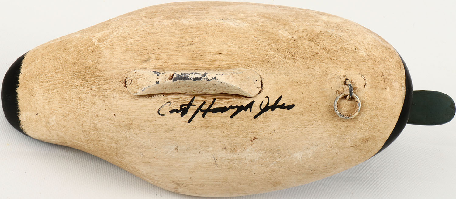 Bluebill Drake by Capt. Harry R. Jobes, Havre de Grace, MD, solid wood, painted eyes, near mint original paint, structurally excellent, bottom is signed. Grade: Excellent ++ - Value: 40 to 150