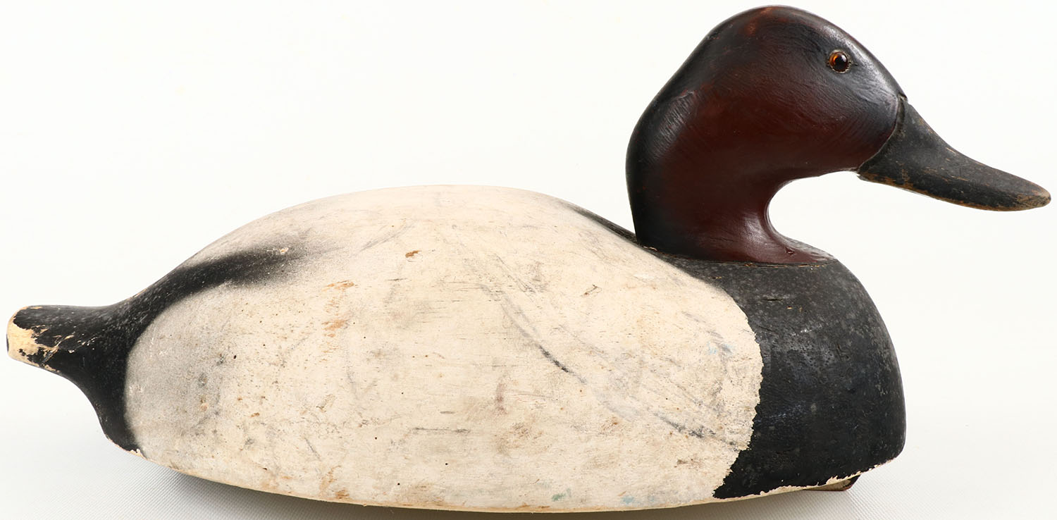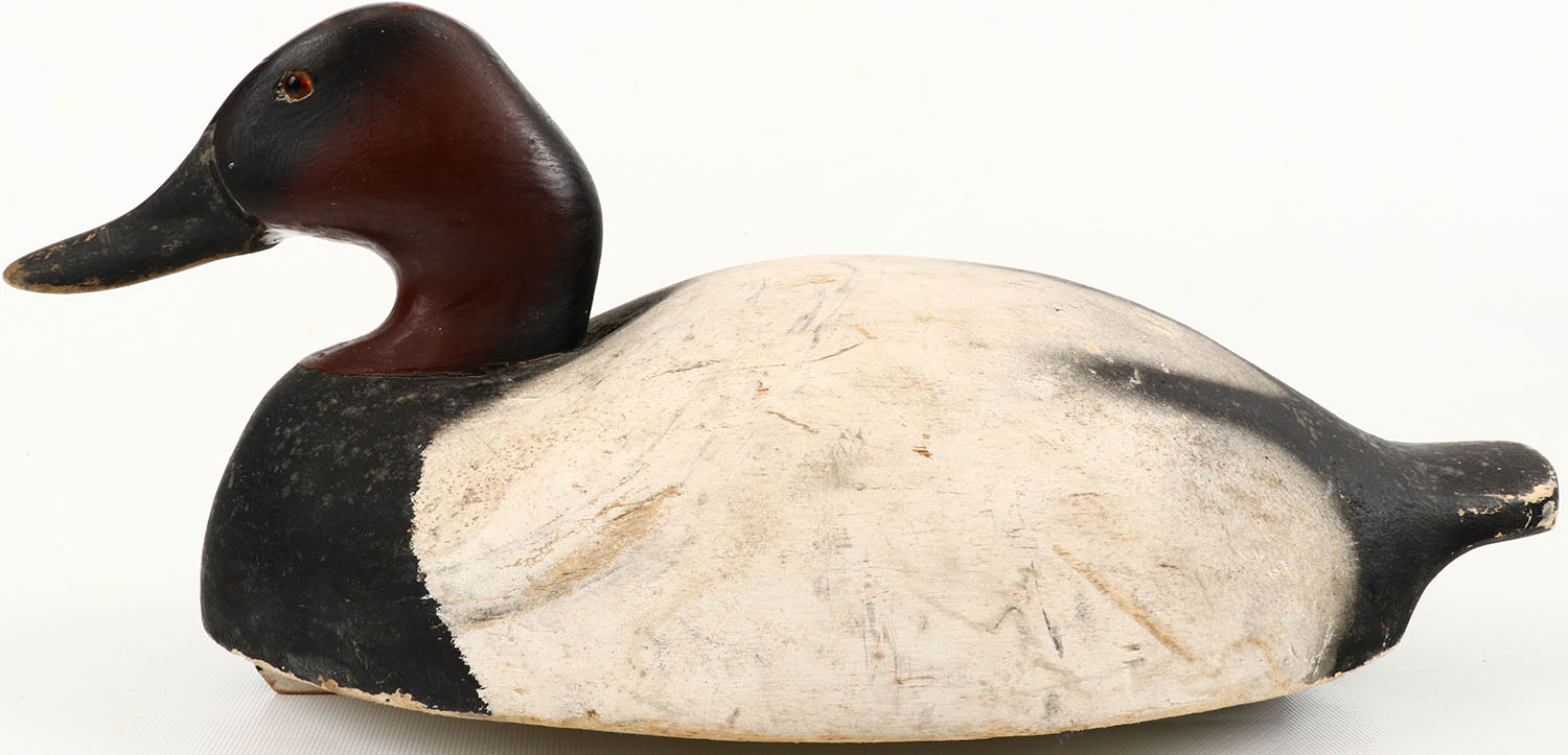 Canvasback Drake by unknown maker, glass eyes, structurally excellent, solid balsa wood with typical wear, original paint. Grade: Excellent - Value: 40 to 150